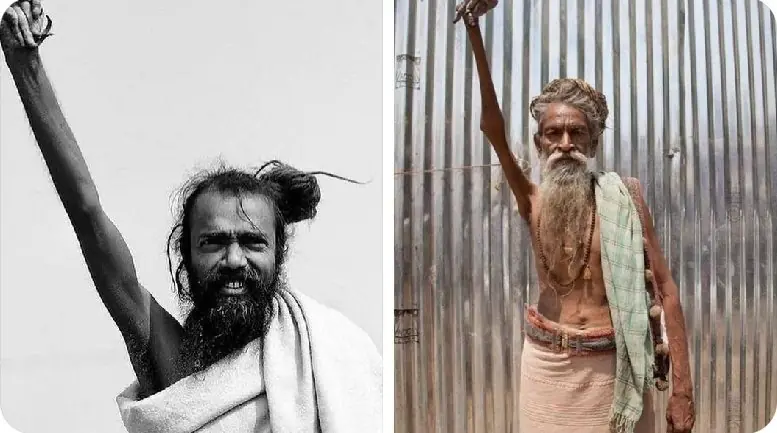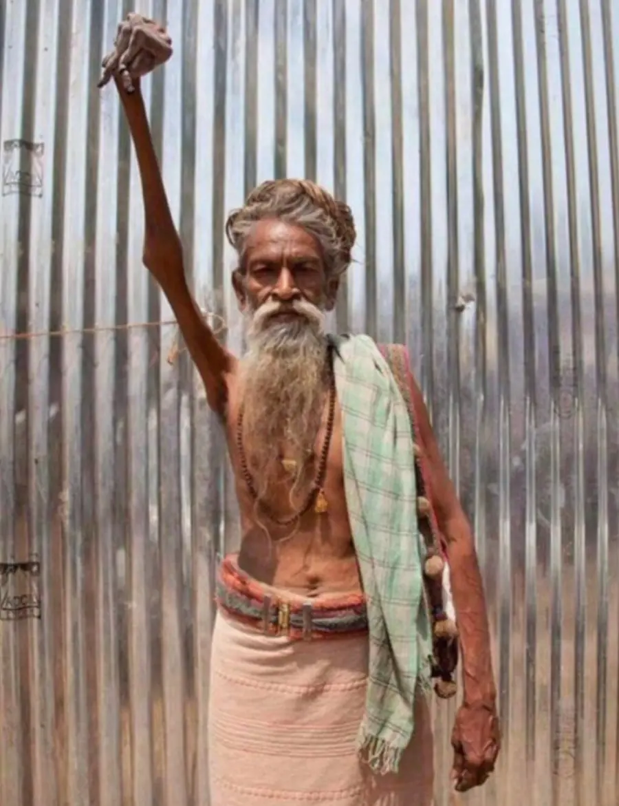 O sadhu indiano Amar Bharati mantém o braço direito erguido desde 1973 como uma forma de devoção ao deus hindu Shiva. O gesto extremo, iniciado como um voto espiritual, se tornou um símbolo de fé e resistência física. Após mais de cinco décadas, o membro permanece atrofiado e imóvel.