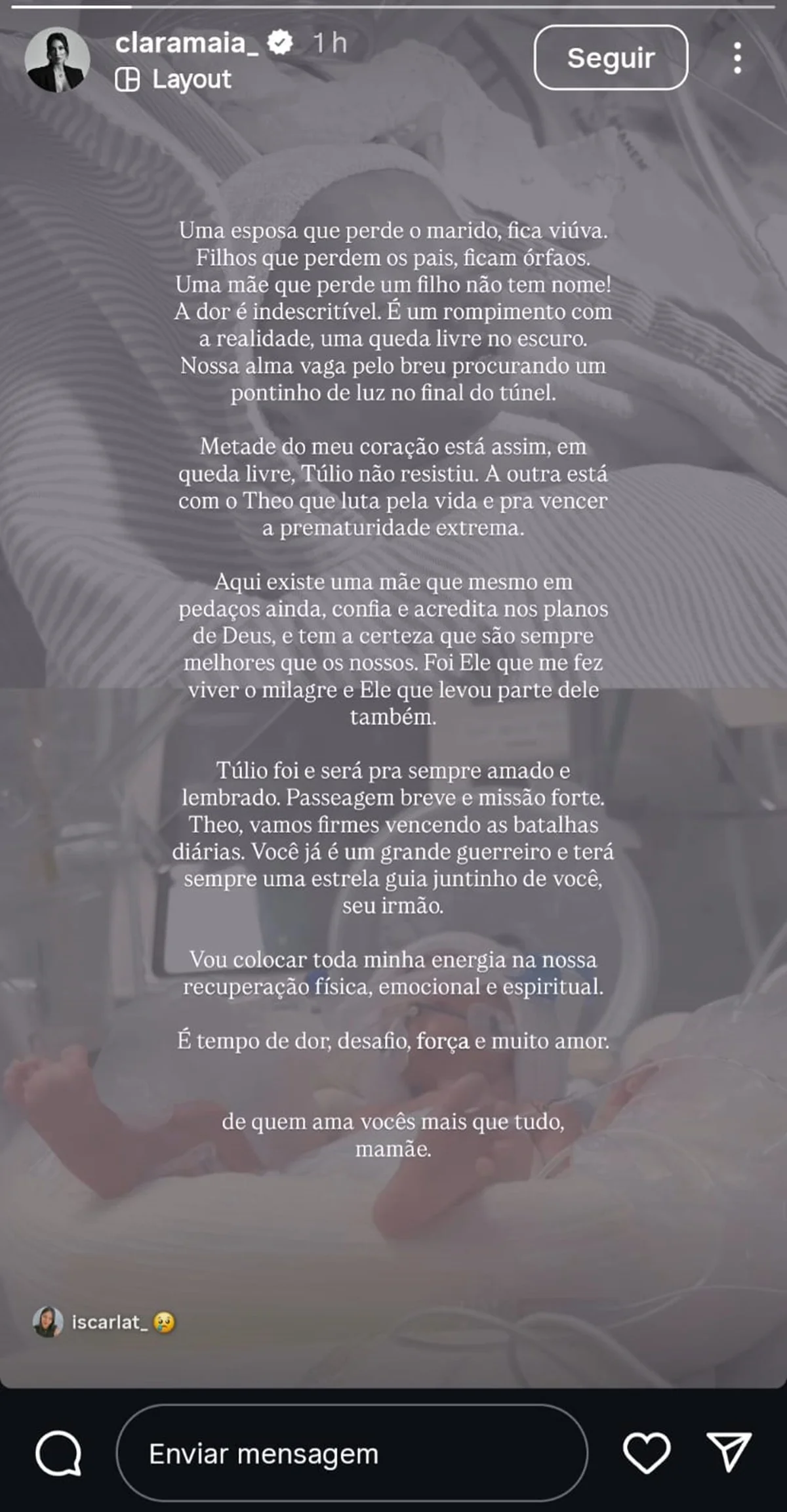 Dez dias após um parto prematuro de emergência, Clara Maia usou as redes sociais para atualizar seus seguidores sobre o estado de saúde de Theo, um dos gêmeos que ela esperava. O outro bebê, Túlio, infelizmente não resistiu. Em uma publicação emocionada no Instagram, a influenciadora afirmou que Theo está se recuperando bem na UTI neonatal, aumentando a quantidade de leite ingerido e reagindo positivamente aos cuidados médicos. “Theo está ótimo, tias!”, escreveu Clara, agradecendo o apoio e as orações recebidas.
