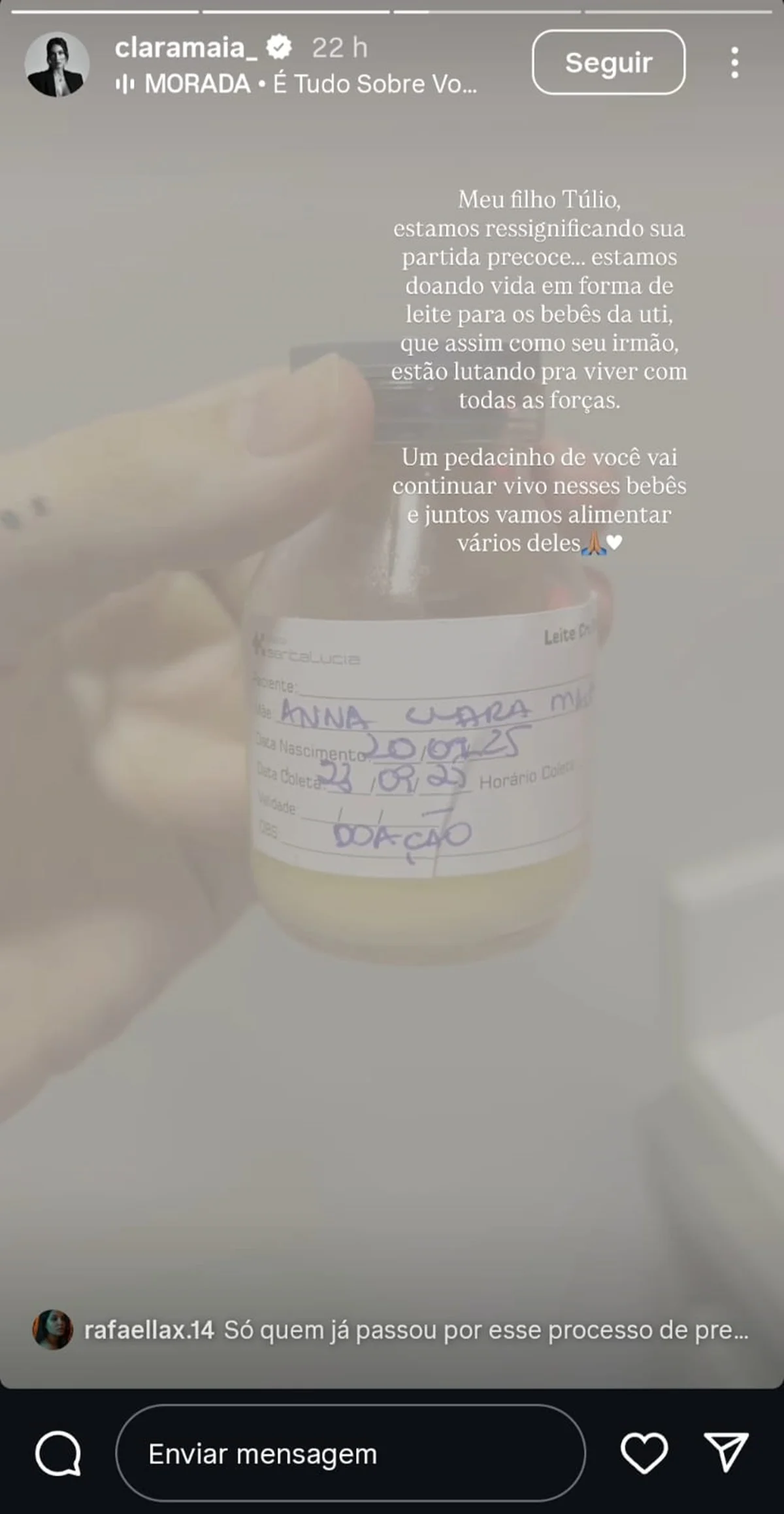Clara também fez questão de agradecer ao marido, André Coelho, pelo apoio durante todo o processo. O casal, que já é pai dos gêmeos José e João, de 1 ano, enfrenta mais uma vez a experiência delicada da UTI neonatal. Além de acompanhar o filho, Clara tem doado leite materno para outros bebês internados, gesto que ela compartilhou com seus seguidores como forma de transformar a dor em solidariedade.