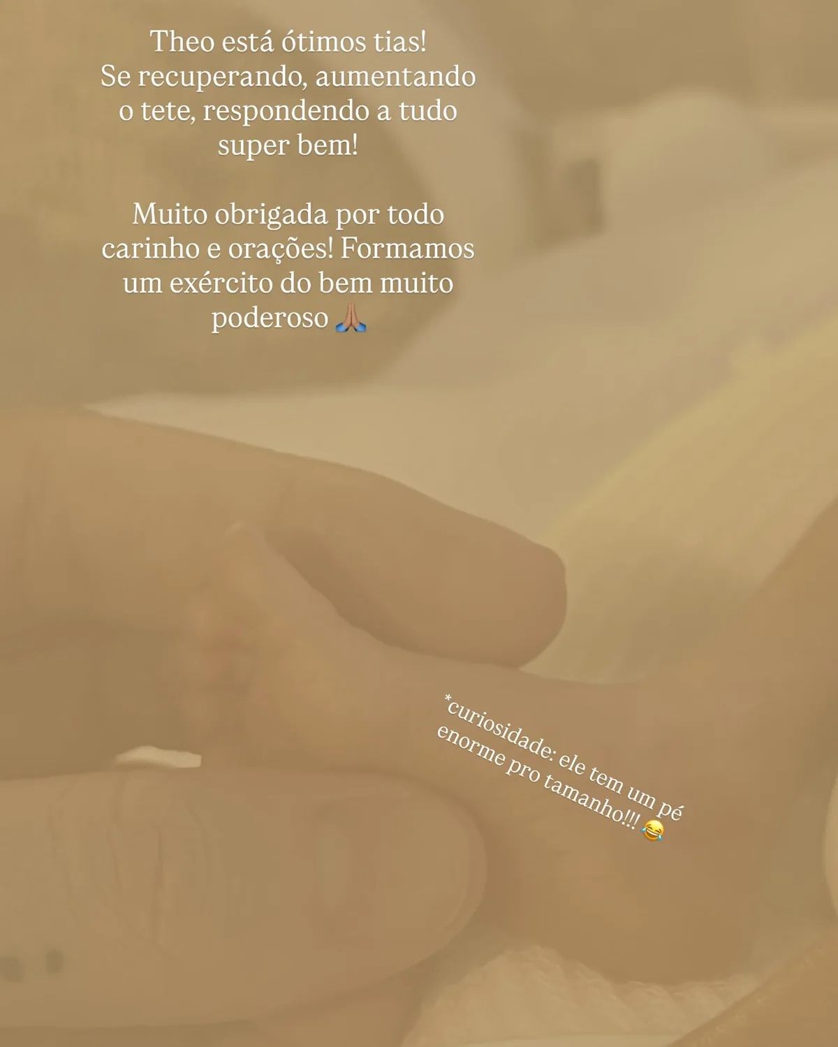 A influenciadora compartilhou ainda um vídeo inédito do parto, ocorrido em 20 de setembro, descrevendo o dia como o mais difícil de sua vida, mas também como um momento de milagre e fé. Os gêmeos foram diagnosticados com a síndrome da transfusão feto-fetal (STFF), uma condição grave que afeta gêmeos idênticos que compartilham a mesma placenta. A doença causou um desequilíbrio no fluxo sanguíneo entre os fetos: Túlio, o receptor, teve o coração sobrecarregado e não resistiu; já Theo, o doador, nasceu com apenas 680g, mas segue lutando pela vida.