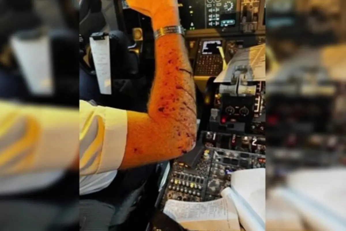 Piloto exibe ferimentos no braço após impacto com objeto não identificado que quebrou para-brisa da cabine. (Foto: Instagram)