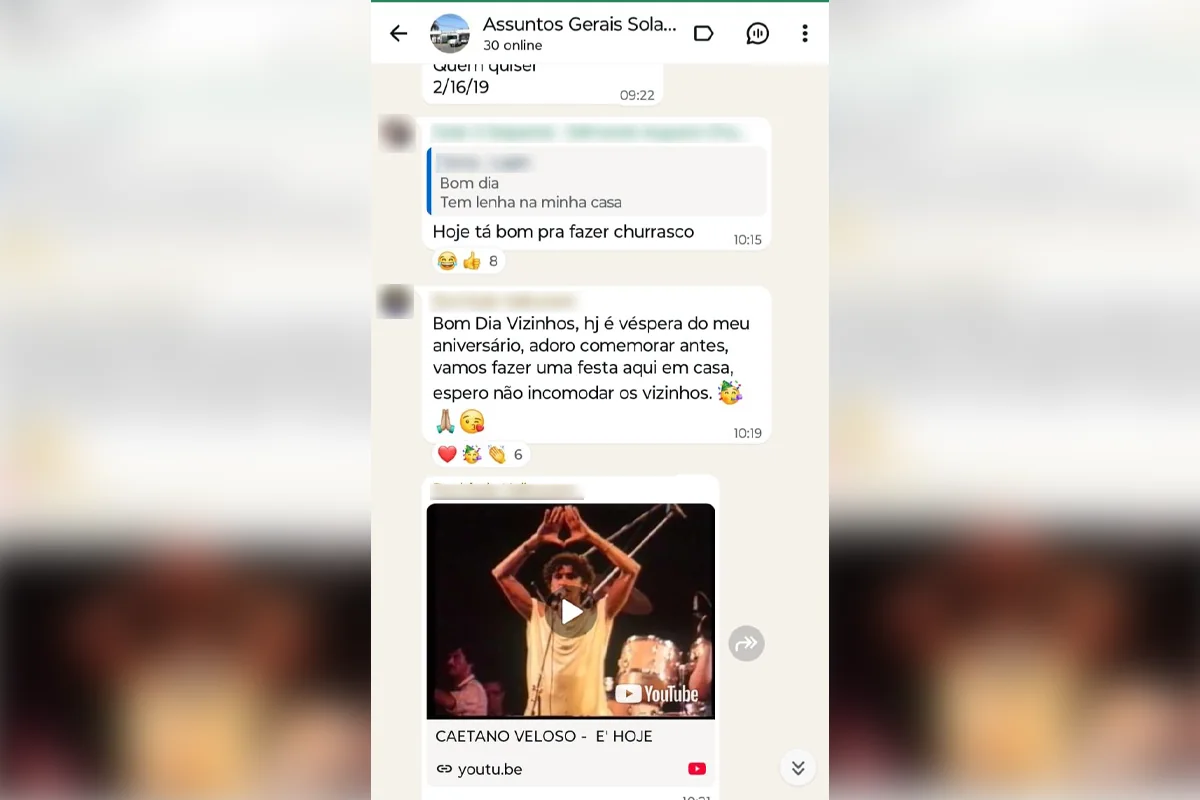 Pouco depois, um morador compartilhou no grupo a música “É hoje”, famosa na voz de Caetano Veloso, cujo trecho diz: “Diga, espelho meu, se há na avenida alguém mais feliz que eu”, reforçando o tom de comemoração entre os participantes.