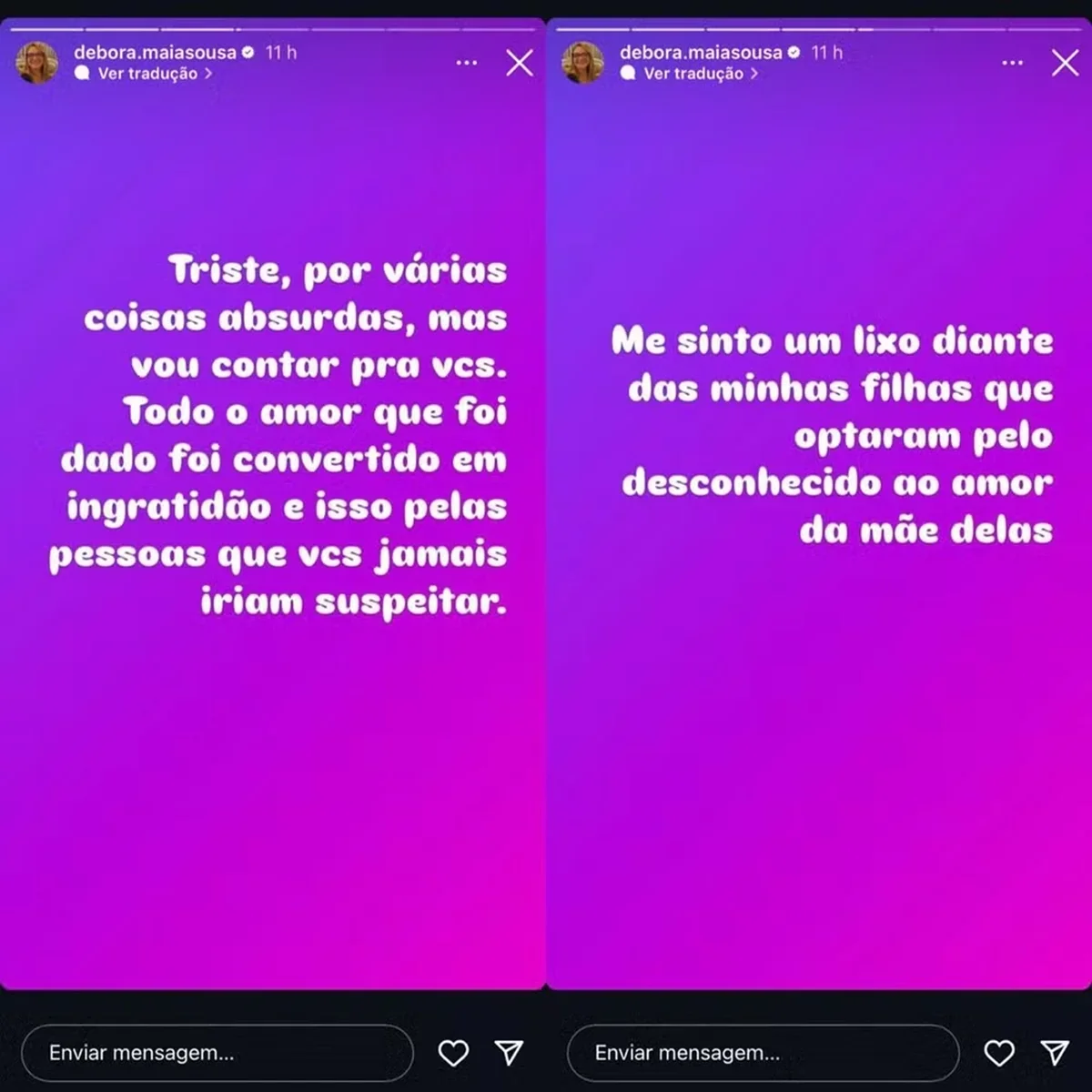No ano anterior, Débora usou as redes sociais para fazer um desabafo emocional, revelando mágoas em relação às filhas. Em uma publicação nos stories do Instagram, ela afirmou que todo o amor que ofereceu foi retribuído com ingratidão, especialmente por pessoas de quem jamais esperava tal atitude.