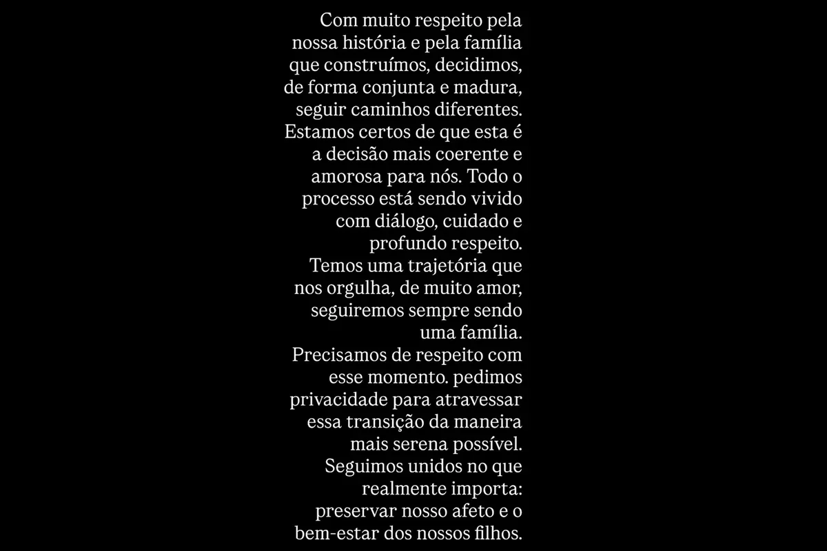 Eles também pediram compreensão e privacidade durante esse período de transição, reforçando que continuarão unidos no cuidado e bem-estar dos filhos. A nota destacou ainda que todo o processo está sendo conduzido com diálogo e respeito.