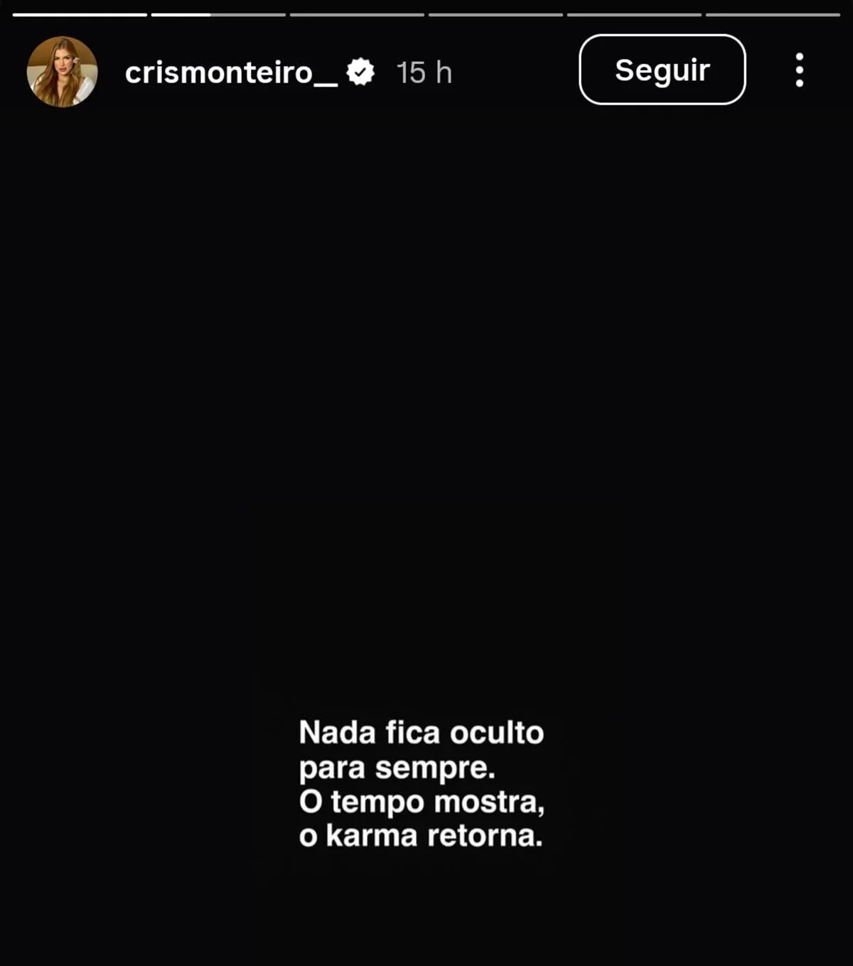 Diante da repercussão, Cris Monteiro, ex-namorada de Babal, decidiu se manifestar de forma indireta nas redes sociais. Por meio dos stories do Instagram, ela compartilhou a frase: “Nada fica oculto para sempre. O tempo mostra, o karma retorna”, o que foi interpretado por muitos como uma resposta ao episódio de violência.