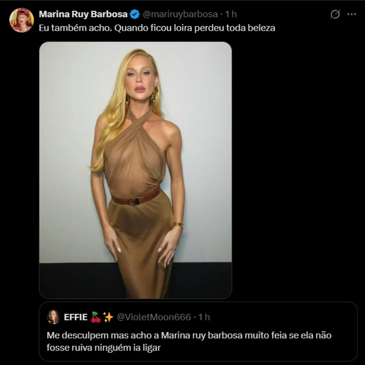 Em resposta, Marina compartilhou uma imagem de quando estava loira e ironizou: “Eu também acho. Quando ficou loira perdeu toda beleza.” A declaração foi vista como uma forma bem-humorada de lidar com o comentário maldoso, e gerou uma onda de apoio dos fãs nas redes sociais.