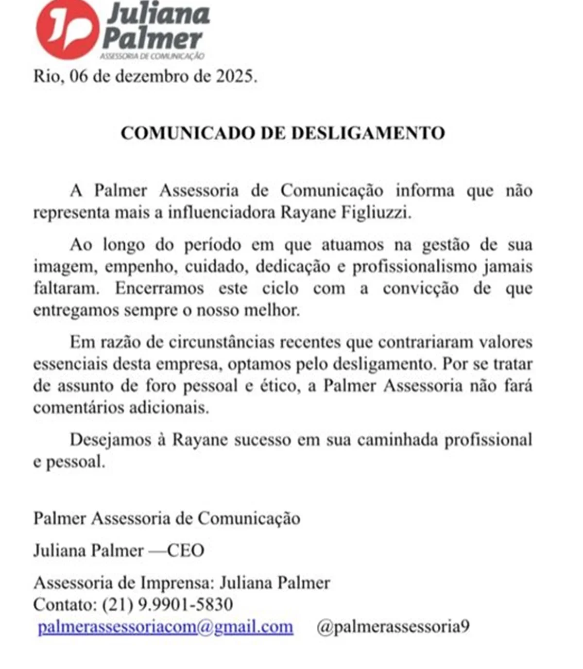 O anúncio do fim da parceria foi feito por meio de um comunicado no Instagram da Palmer Assessoria de Comunicação. A empresa afirmou que sempre prezou pelo profissionalismo e dedicação durante o tempo em que trabalhou com Rayane, mas optou por encerrar o ciclo, alegando que os recentes acontecimentos contrariaram os valores da empresa.