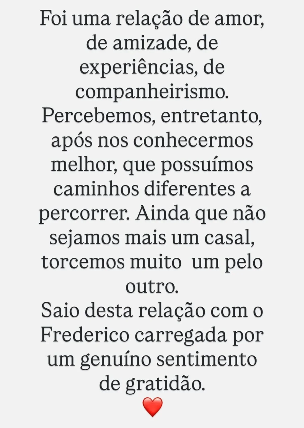 Segundo Cintia, a relação foi marcada por companheirismo, amizade e experiências compartilhadas, mas ambos perceberam que possuem objetivos diferentes a seguir. Ela ressaltou que, apesar da separação, mantém carinho e gratidão por Fred, a quem ainda deseja o melhor.