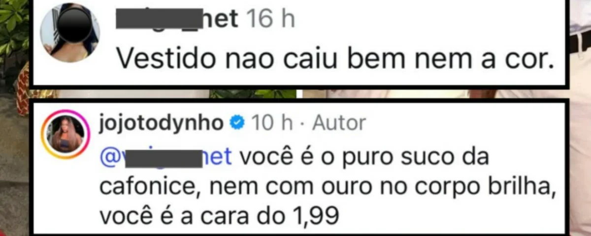 Uma internauta comentou que o vestido “não caiu bem, nem a cor”, sugerindo que o look não valorizava Jojo. A resposta da cantora foi imediata e direta: “Você é o puro suco da cafonice. Nem com ouro no corpo brilha. Você é a cara do 1,99”.