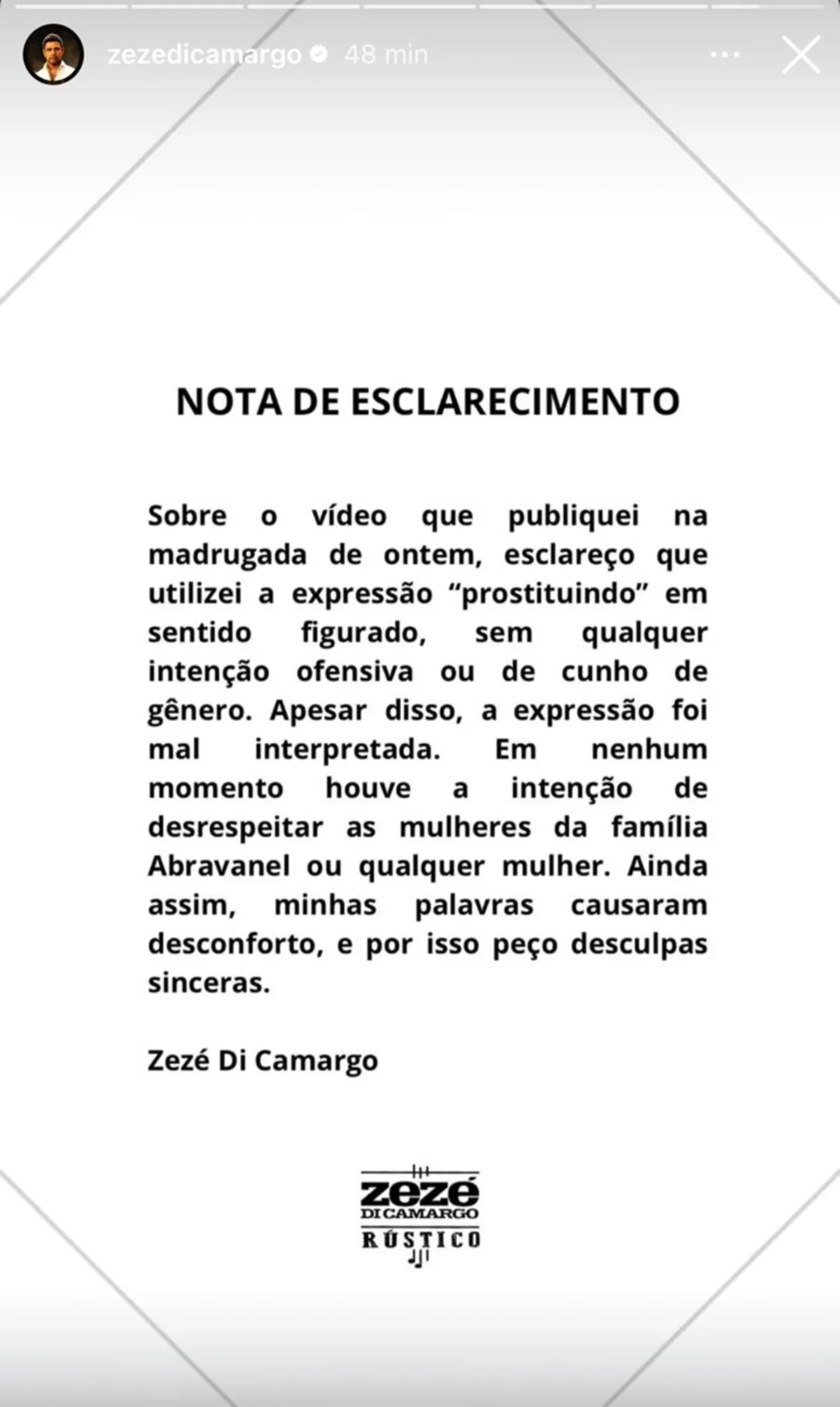 O sertanejo publicou um comunicado em que pede desculpas por qualquer desconforto causado. Ele reforçou que não quis desrespeitar as mulheres da família Abravanel ou qualquer outra mulher, e lamentou que suas palavras tenham sido mal compreendidas.