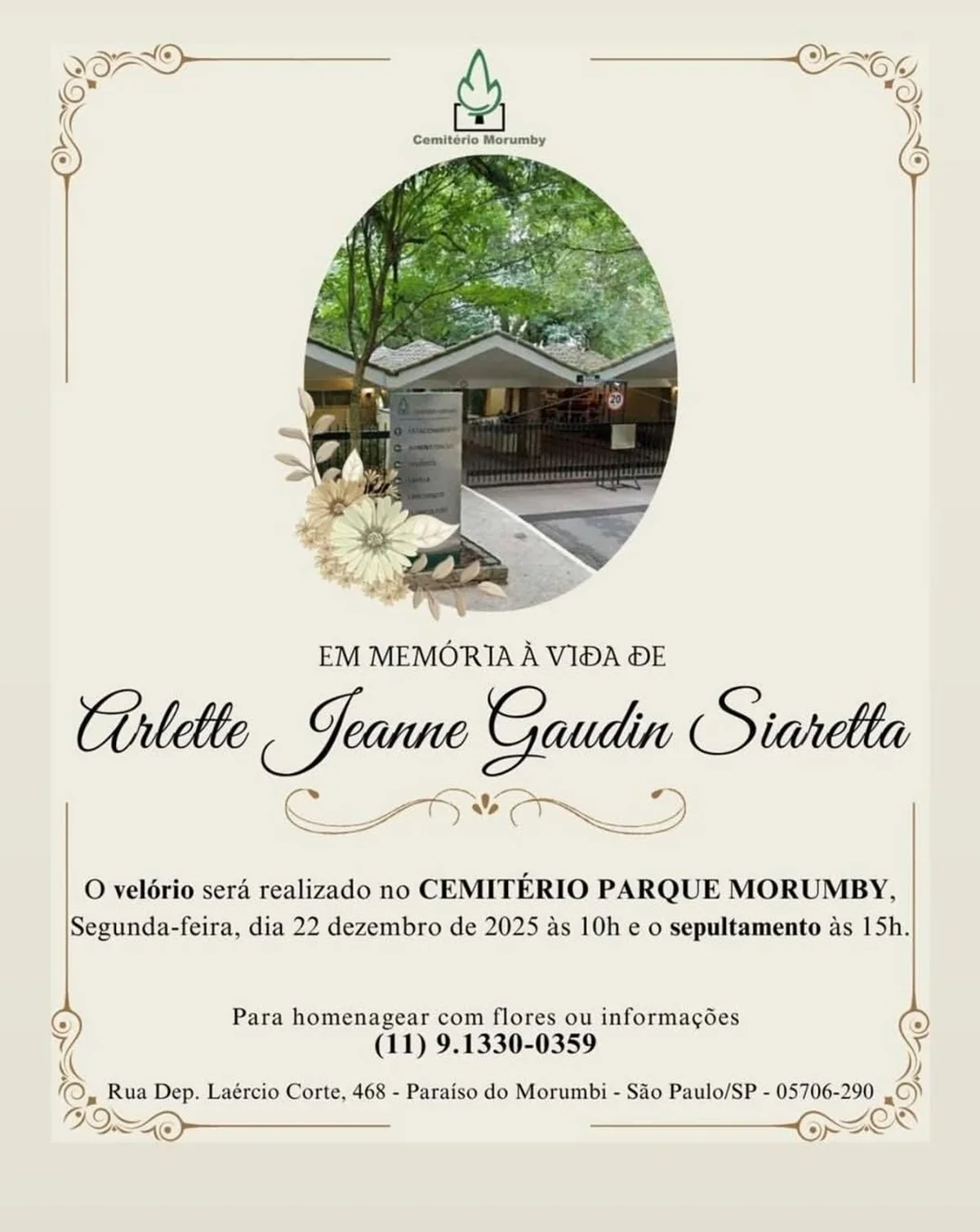 A causa da morte não foi informada. O velório acontece no Cemitério Parque Morumby, em São Paulo, e o sepultamento está marcado para as 15h desta segunda-feira.