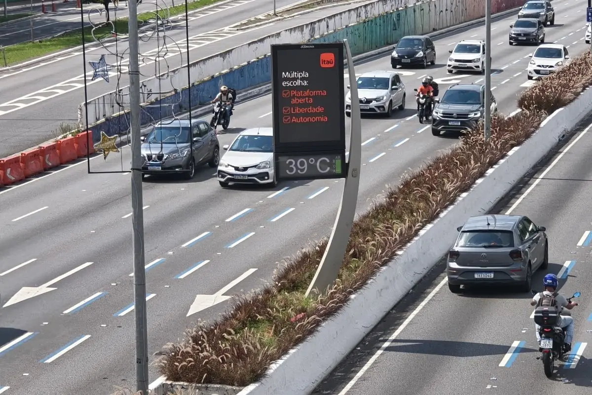 Termômetro digital na Marginal registra 39°C em dia de calor histórico em São Paulo (Foto: Instagram)