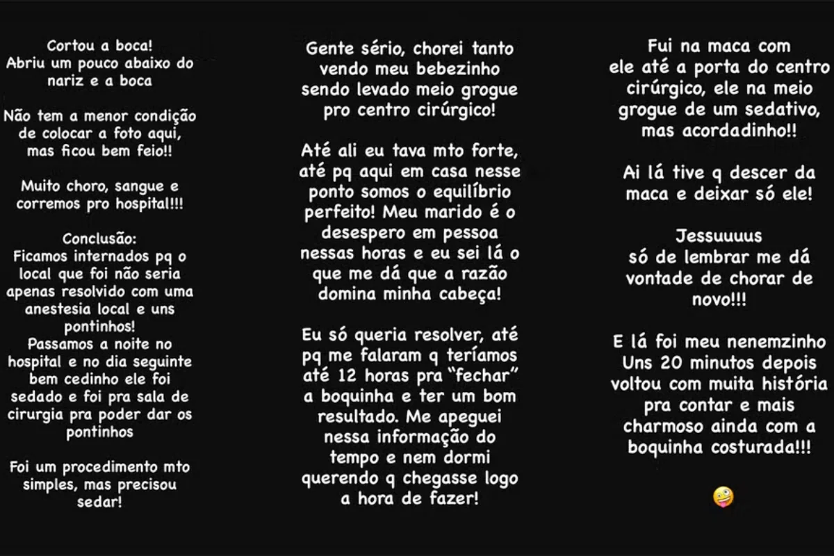 Sthefany aproveitou o desabafo para alertar outros pais sobre a necessidade de redobrar a atenção em crianças nessa fase mais ativa, lembrando que o caso poderia ter sido mais sério.
