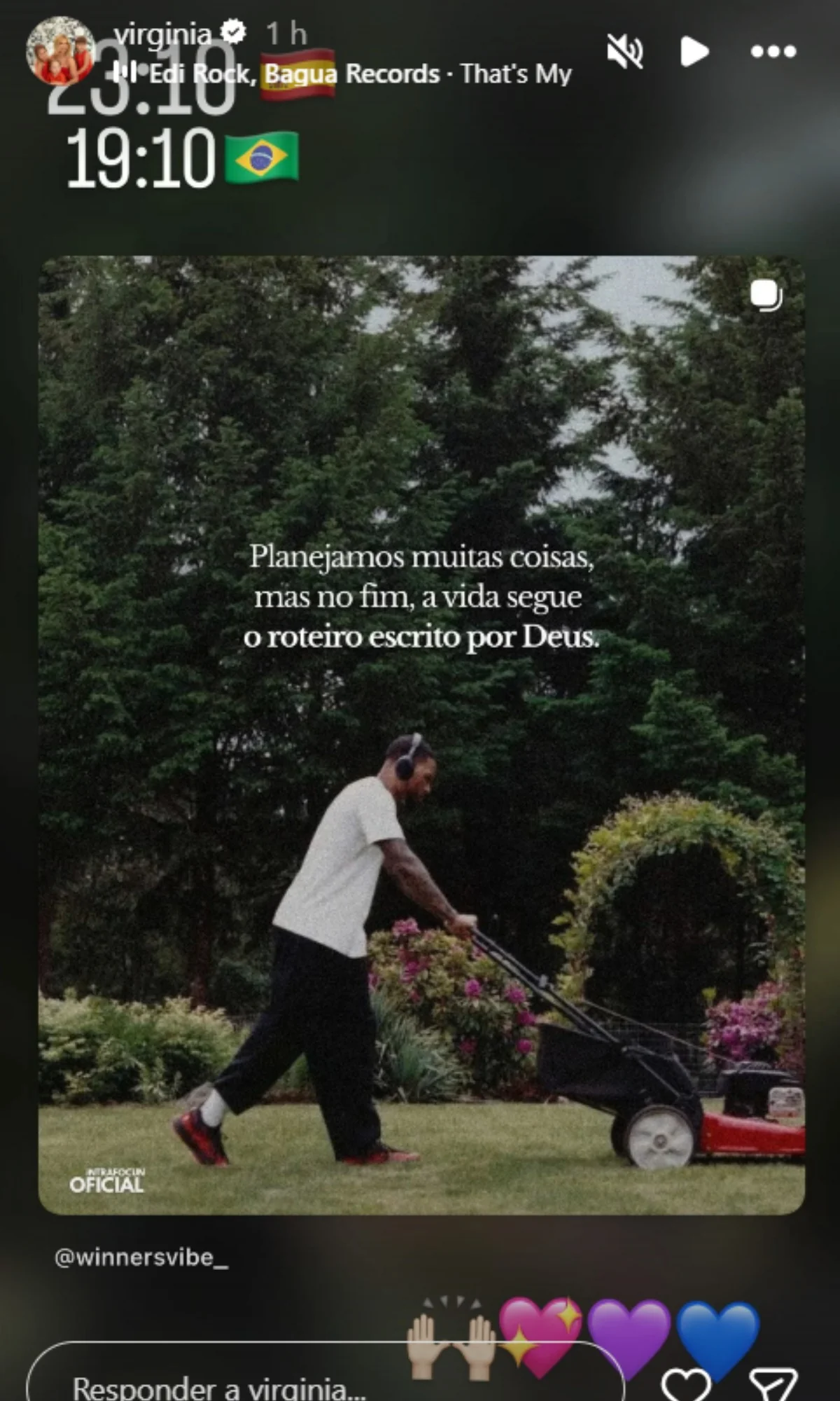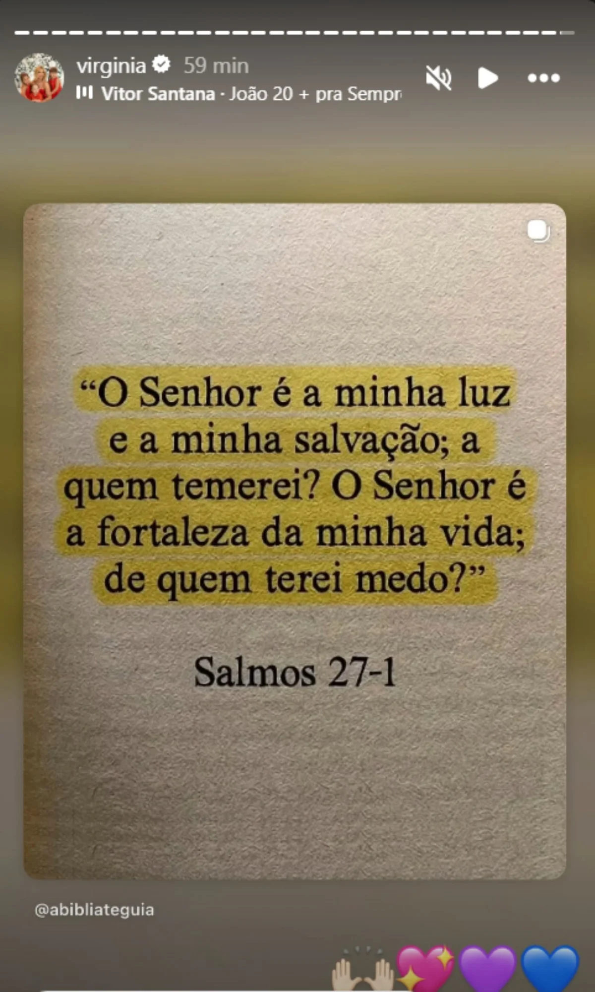 Em uma outra publicação, ela afirmou que nem sempre nossos projetos saem conforme o planejado: “Planejamos muitas coisas, mas no fim, a vida segue o roteiro escrito por Deus”. Pouco depois, compartilhou um versículo bíblico encorajando a não temer “pois o Senhor é a minha luz e a minha salvação; a quem temerei?”.