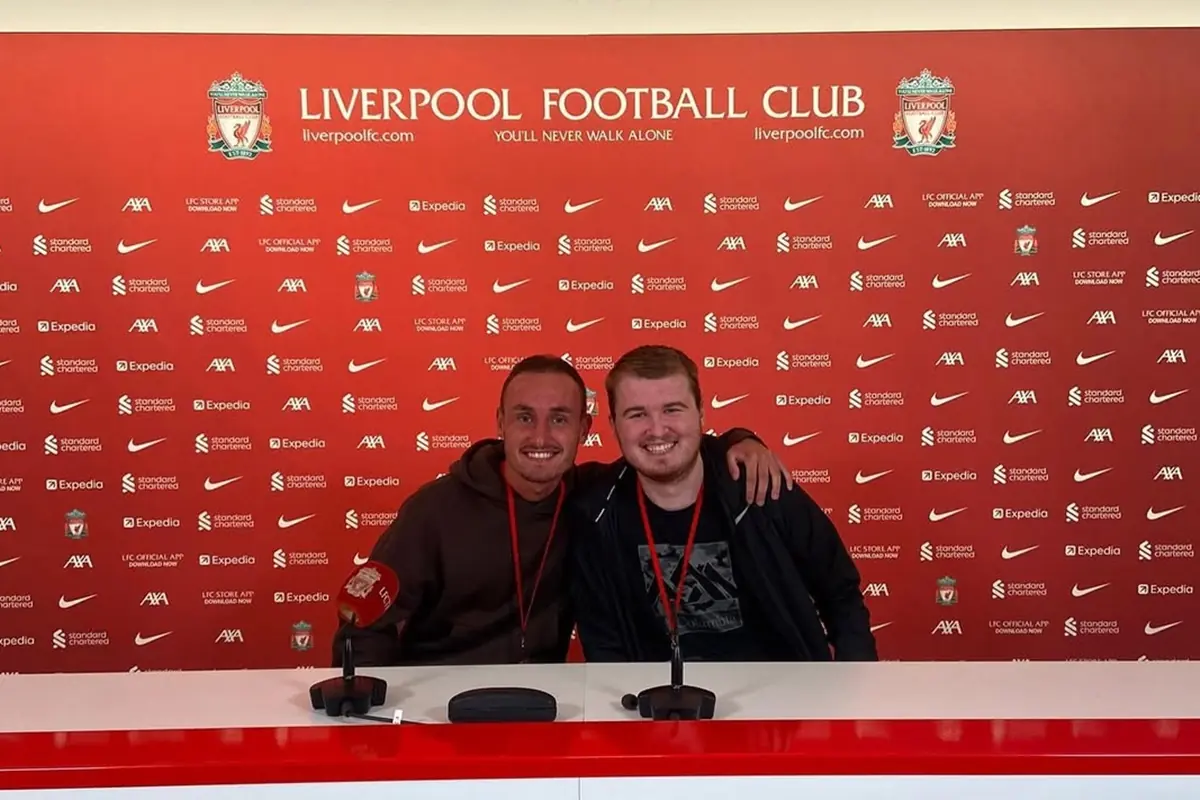 Torcedor do Liverpool, Kieran Shingler, posa ao lado de amigo no centro de imprensa do clube. (Foto: Instagram)