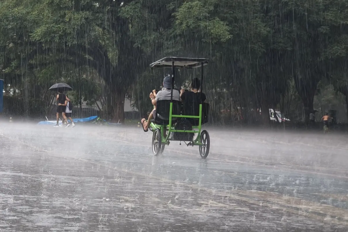 Pessoas enfrentam chuva intensa em ciclotáxi pelas ruas alagadas (Foto: Instagram)