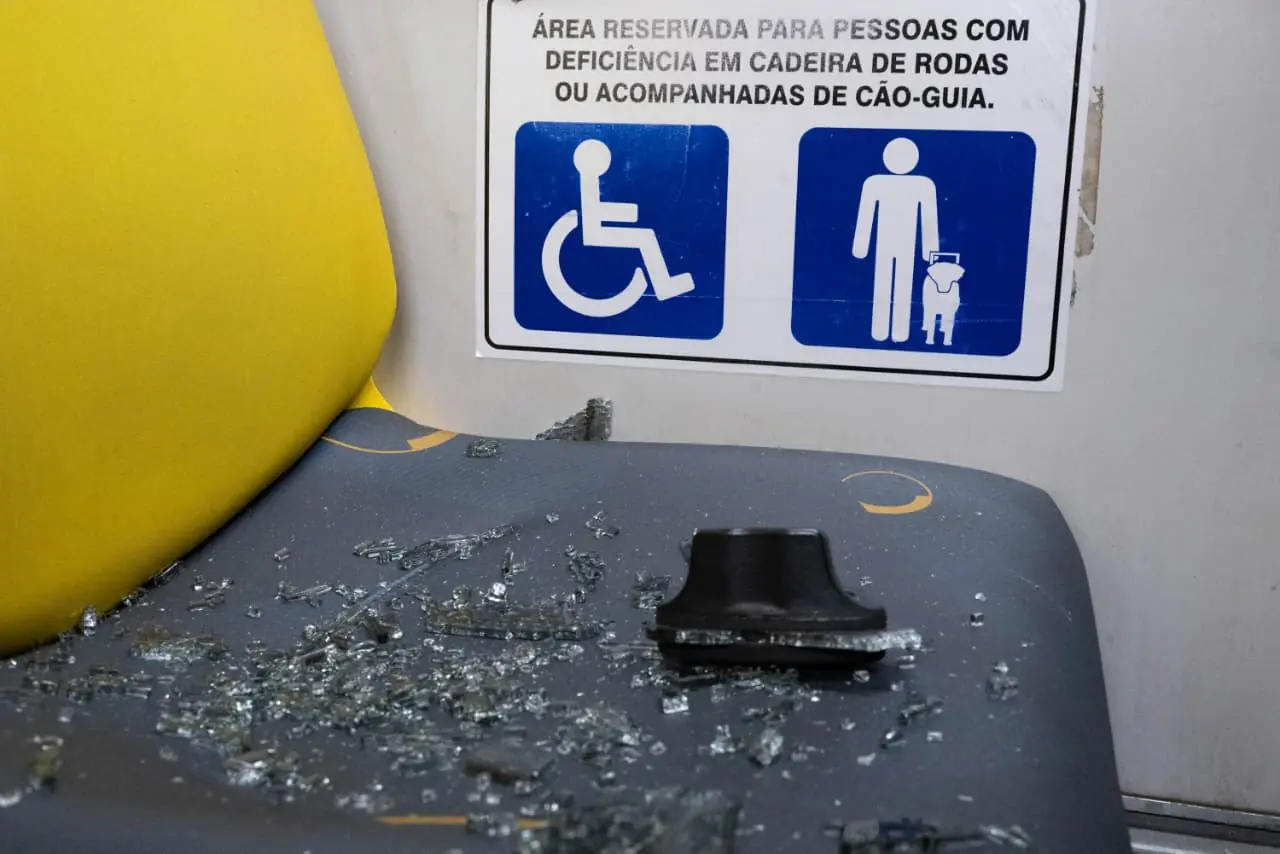Assento reservado a pessoas com deficiência danificado após onda de depredação de ônibus no DF (Foto: Instagram)