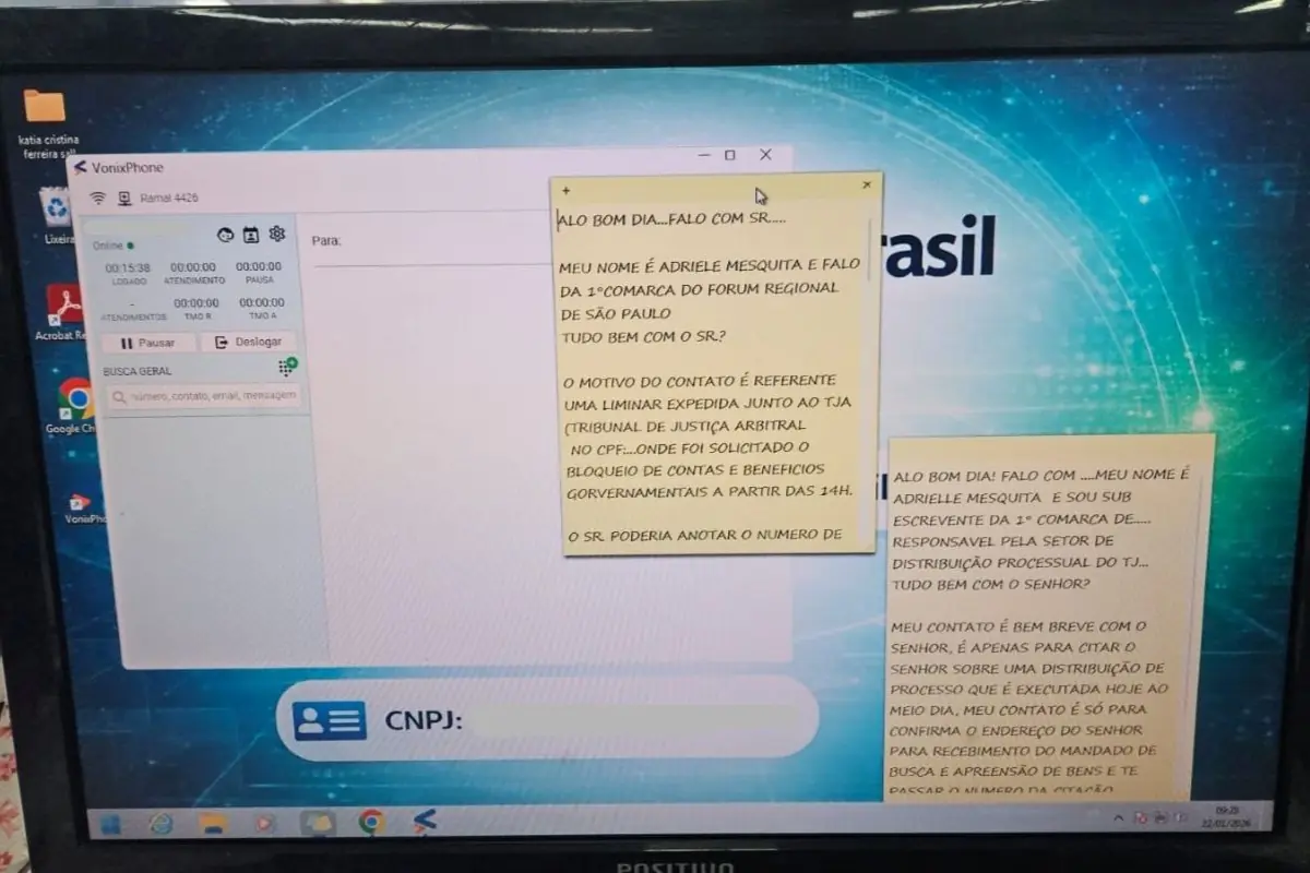 Tela de computador exibe software de cobrança e anotações com mensagens de intimidação a devedores (Foto: Instagram)