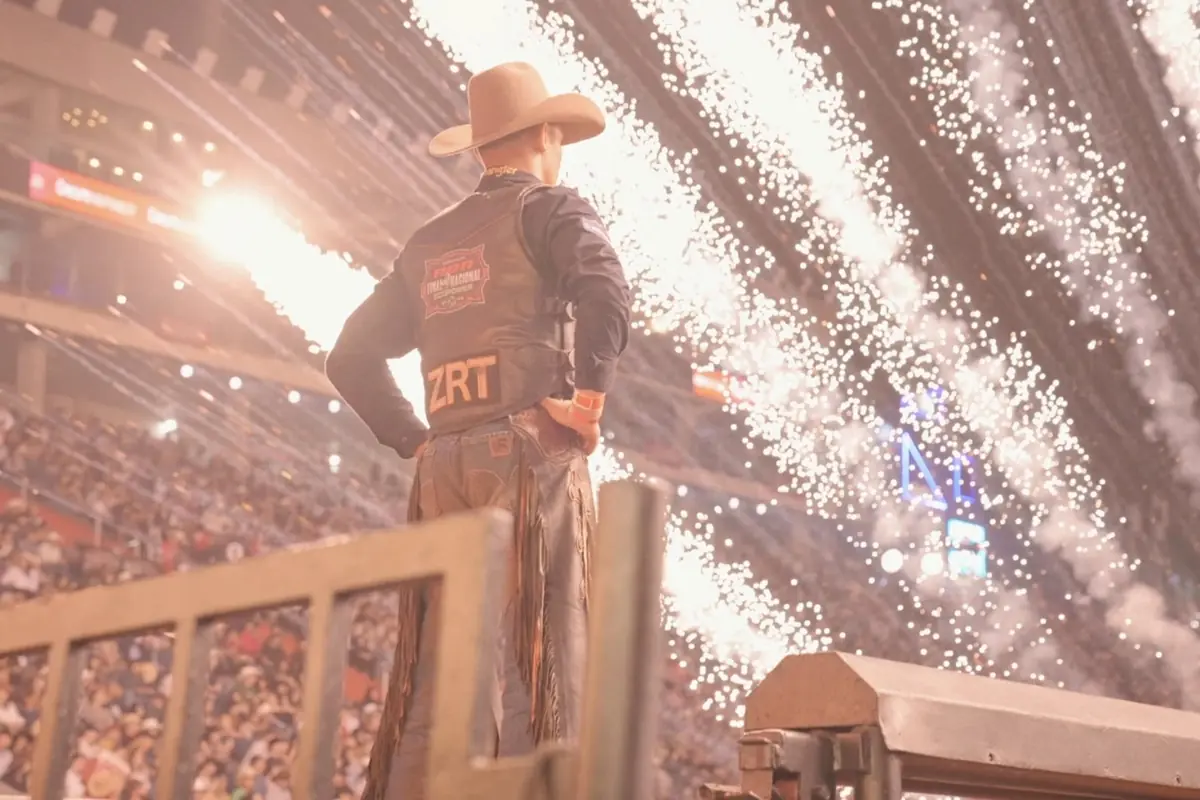 Peão se prepara para a montaria em rodeio iluminado por fogos de artifício (Foto: Instagram)