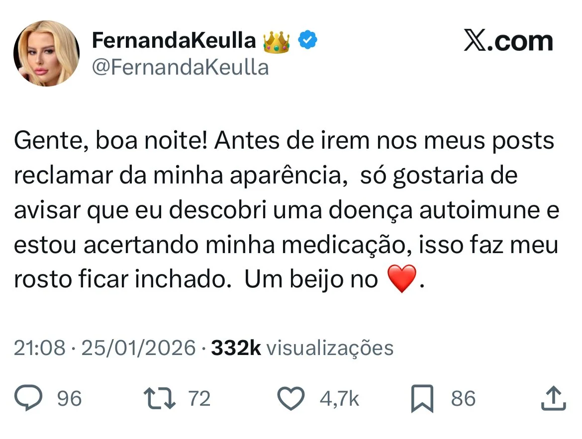 Em um novo post no X, antigo Twitter, Fernanda Keulla comentou de forma direta sobre as críticas: “Gente, boa noite! Antes de irem aos meus posts reclamar da minha aparência, só gostaria de avisar que descobri uma doença autoimune e estou acertando minha medicação, isso faz meu rosto ficar inchado. Um beijo no coração”. A publicação reforça o esclarecimento de que o inchaço facial faz parte de um período de adaptação ao tratamento.