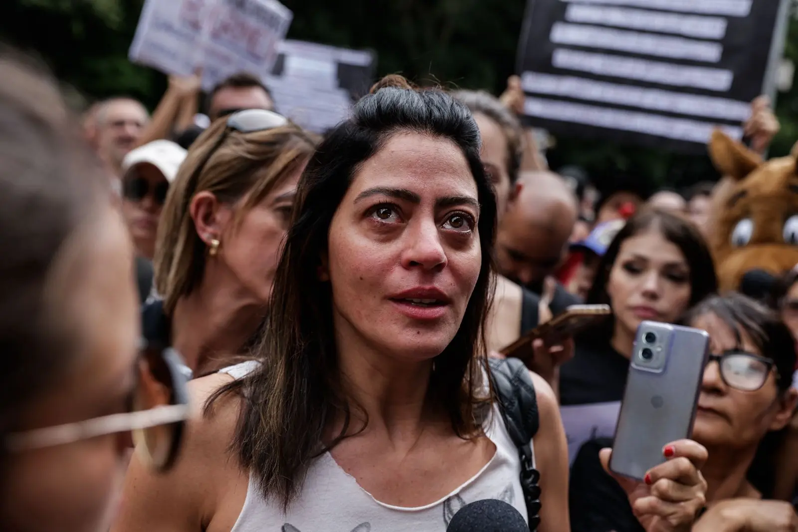 Manifestante emocionada durante ato em frente ao MASP em defesa do Cão Orelha (Foto: Instagram)