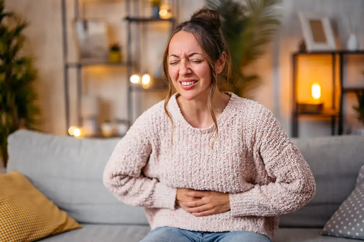Mulher sentada no sofá com expressão de desconforto abdominal. (Foto: Instagram)