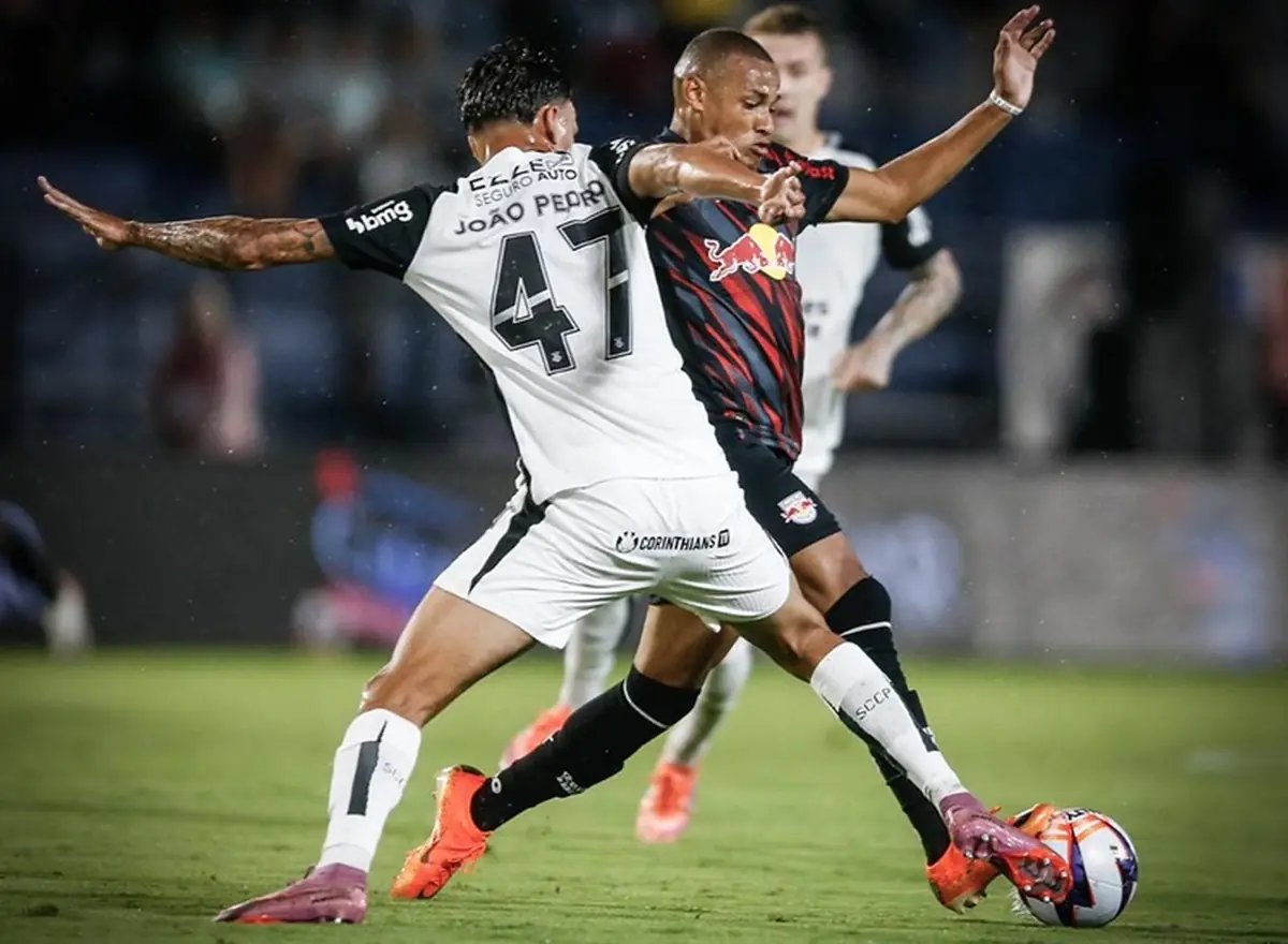 João Pedro em disputado lance contra jogador do RB Bragantino na Neo Química Arena (Foto: Instagram)