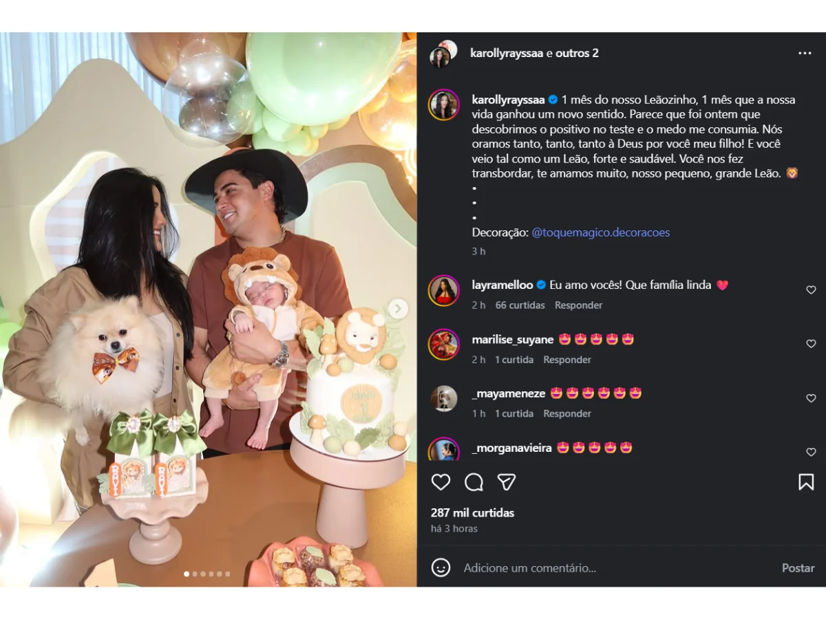Nesta quinta-feira (12/2), Natanzinho Lima e sua esposa, a influenciadora Karolly Rayssa, comemoraram o primeiro mês de vida do filho Ravi com uma decoração toda inspirada em leões. Os papais de primeira viagem abriram mão do tradicional “só o bolinho” e investiram em uma ambientação caprichada, fazendo a festa parecer uma celebração de 1 ano.