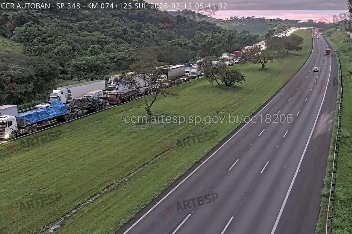 Rodovia dos Bandeirantes registra retenção entre os quilômetros 72 e 76 na pista sentido Norte, com todas as cinco faixas completamente interditadas. O bloqueio provoca lentidão e longas filas de veículos que se estendem por vários quilômetros, afetando o fluxo de quem segue em direção à região metropolitana de São Paulo. Até o momento, não há informações oficiais sobre as causas que motivaram o fechamento total das faixas, e equipes de socorro e atendimento ao usuário ainda não divulgaram previsão de liberação.
