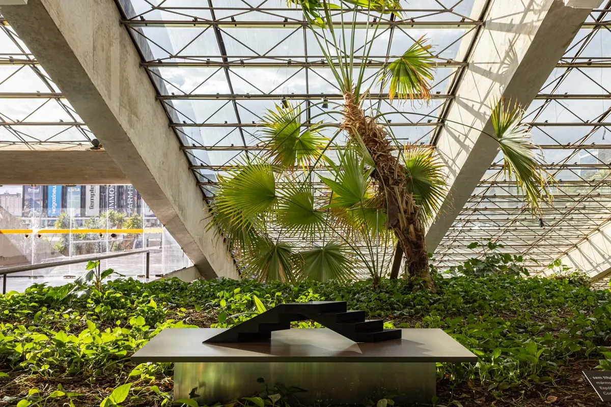Escultura abstrata iluminada pela claraboia no percurso sensorial. (Foto: Instagram)