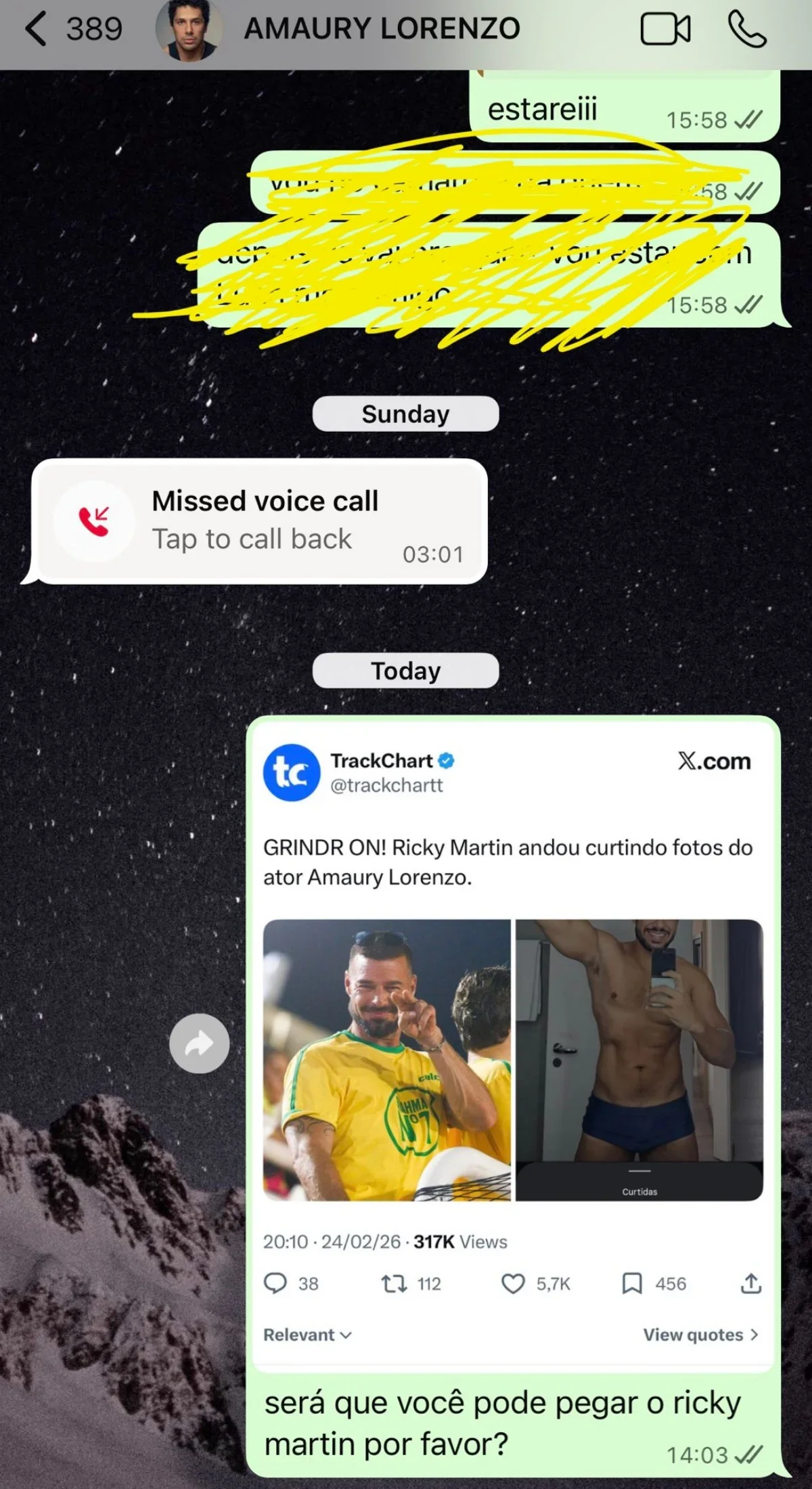 O ator divulgou uma captura de tela de uma conversa nas redes sociais após uma interação entre Amaury e Ricky que gerou bastante repercussão. A situação chamou a atenção dos seguidores e rapidamente se tornou um dos tópicos mais comentados nas plataformas digitais.