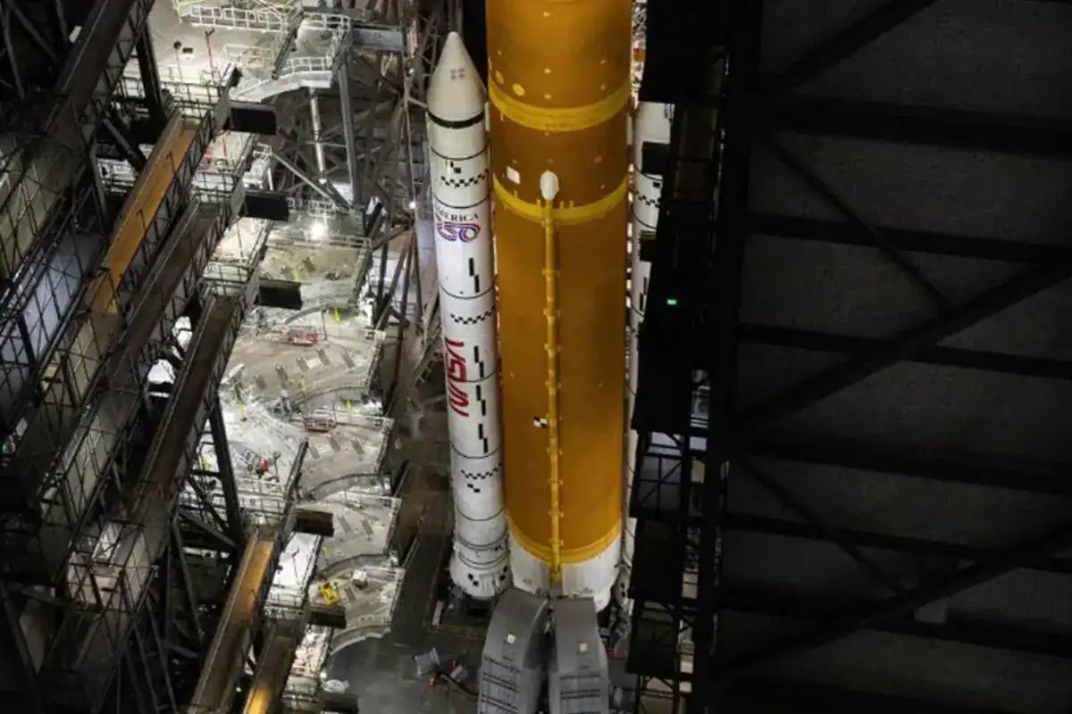 Foguete SLS da missão Artemis IV em preparação no VAB da NASA (Foto: Instagram)