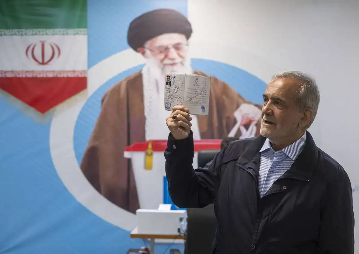 Eleitor iraniano exibe documento de votação diante de retrato do líder supremo em clima de incerteza geopolítica (Foto: Instagram)