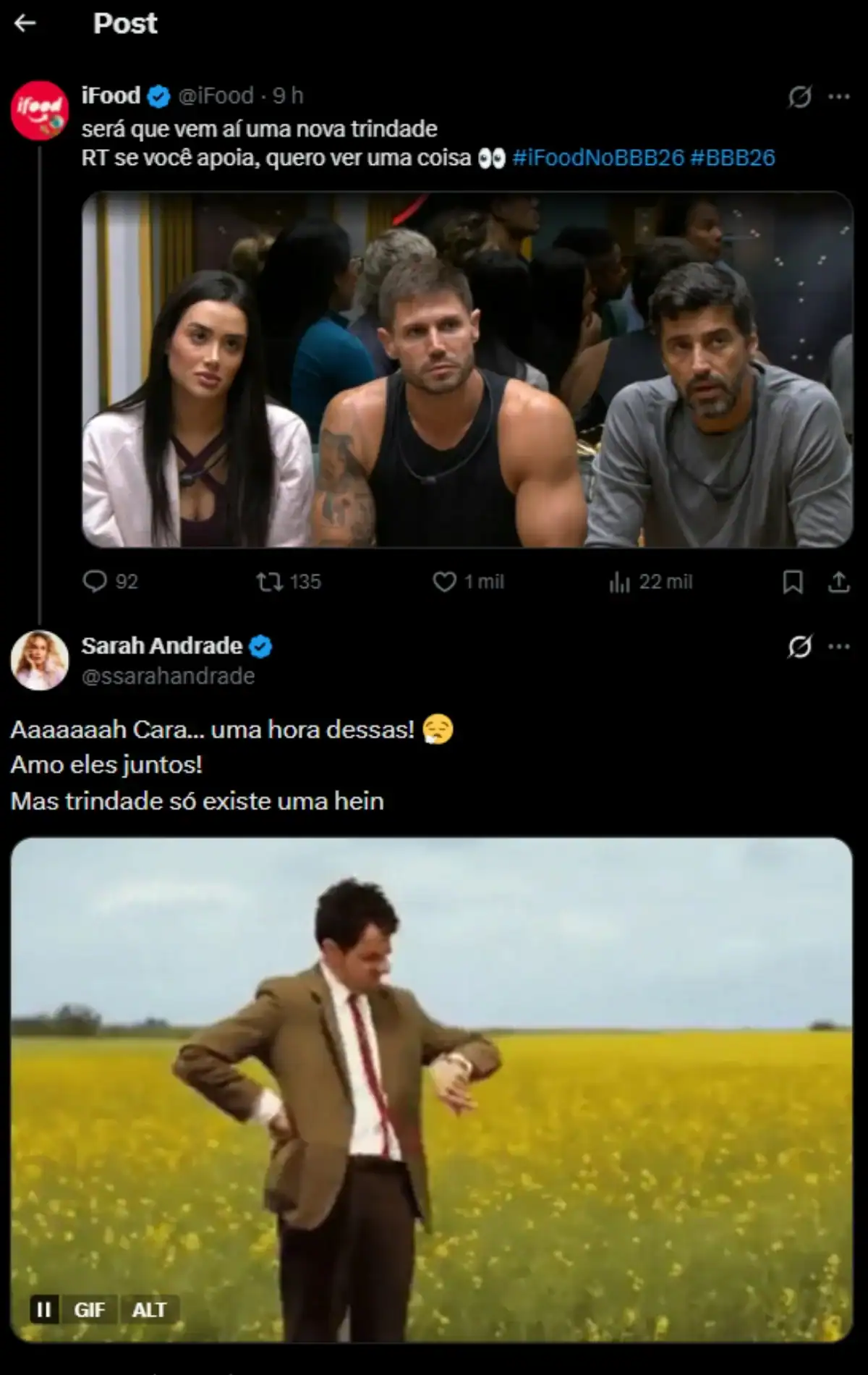 A influenciadora comentou uma recente publicação de uma marca que sugeriu uma nova formação da “Trindade” no reality show. A proposta gerou discussões entre os fãs do programa, que estão ansiosos para ver como essa nova dinâmica irá se desenrolar nas próximas semanas.