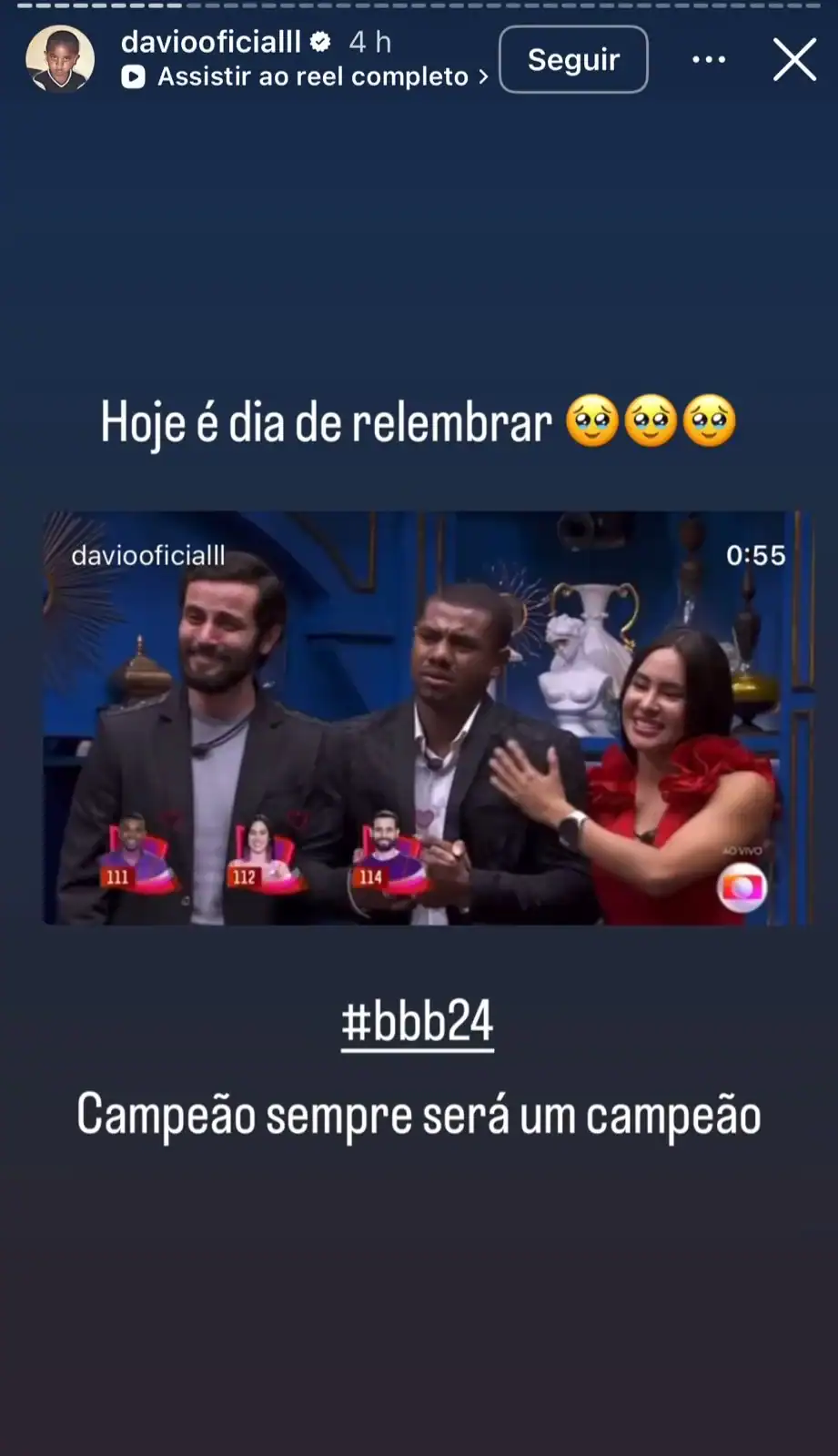 As declarações, porém, aparentemente não agradaram Davi. O campeão da edição resolveu relembrar sua trajetória no reality e fez diversas postagens nas redes sociais para se reafirmar como vencedor: “Campeão sempre será um campeão!”, escreveu na primeira publicação, junto com vídeos de momentos marcantes durante o confinamento.