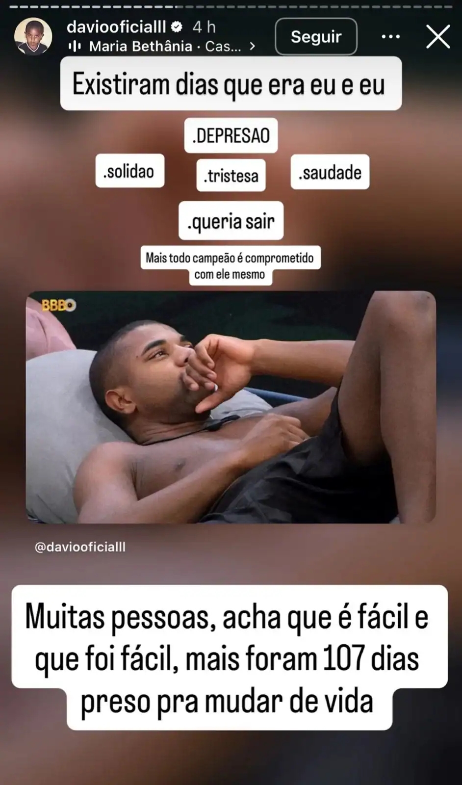 Em seguida, Davi também desabafou sobre sua experiência e ressaltou que, para quem vê de fora, tudo pode parecer fácil, mas dentro da casa enfrentou momentos de depressão, solidão, tristeza, saudade e até vontade de desistir. Mesmo assim, afirmou que se manteve firme e comprometido consigo mesmo: “Mas todo campeão é comprometido com ele mesmo”, declarou.