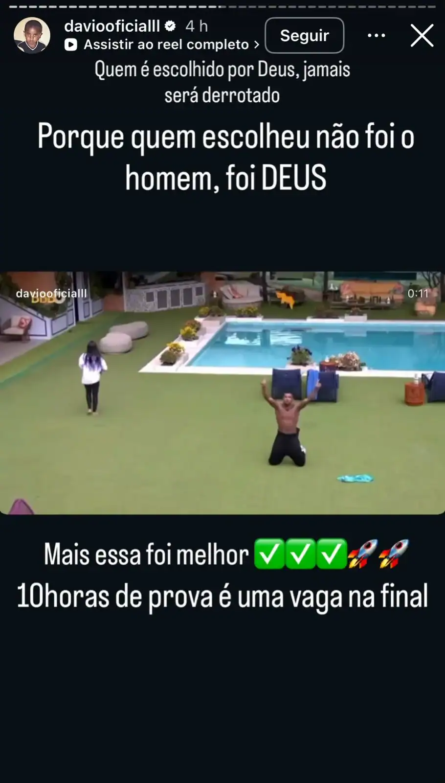 Sem citar Beatriz, Brito também afirmou que se considera “escolhido por Deus” e reforçou sua vitória: “Quem é escolhido por Deus jamais será derrotado! Porque quem escolheu não foi o homem, foi Deus!”, disse. Por fim, Davi defendeu que quem é campeão entende que a derrota é apenas um passo para o sucesso e garantiu que segue invicto.