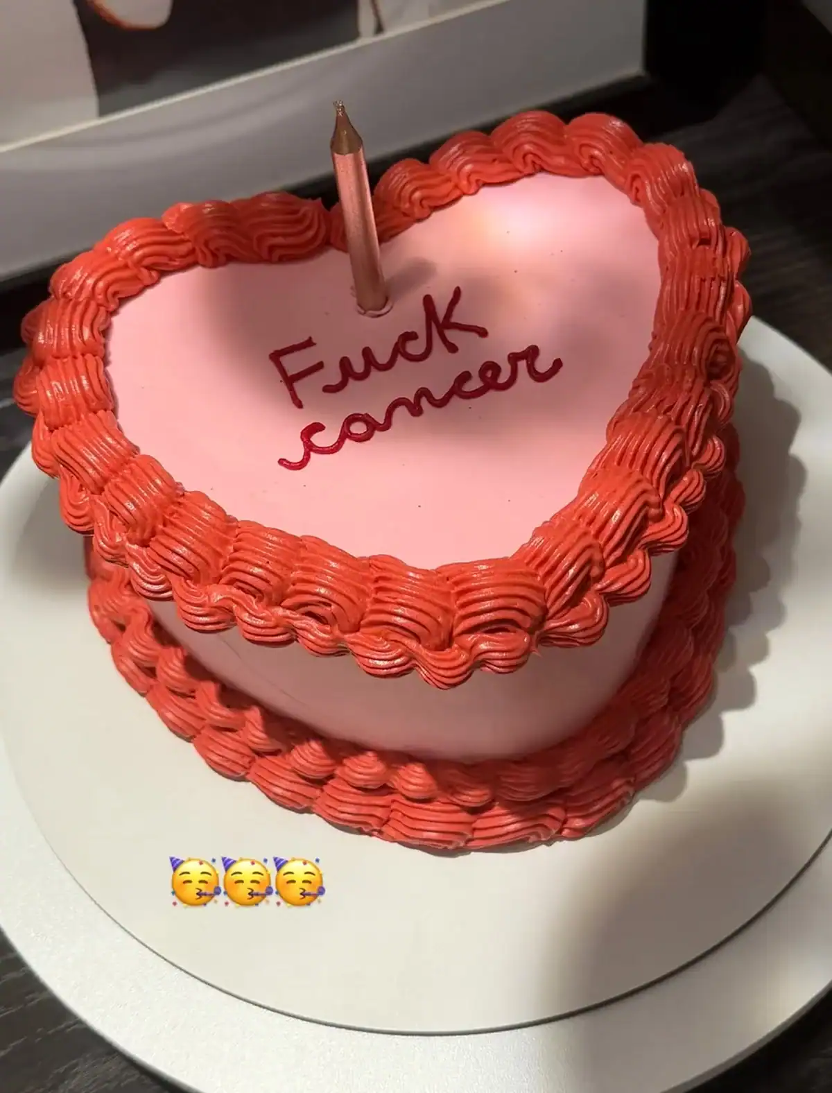 Na postagem, a influenciadora comemorou a data especial com um bolo em formato de coração, decorado com a frase “fuck câncer” (foda-se câncer, em tradução livre).