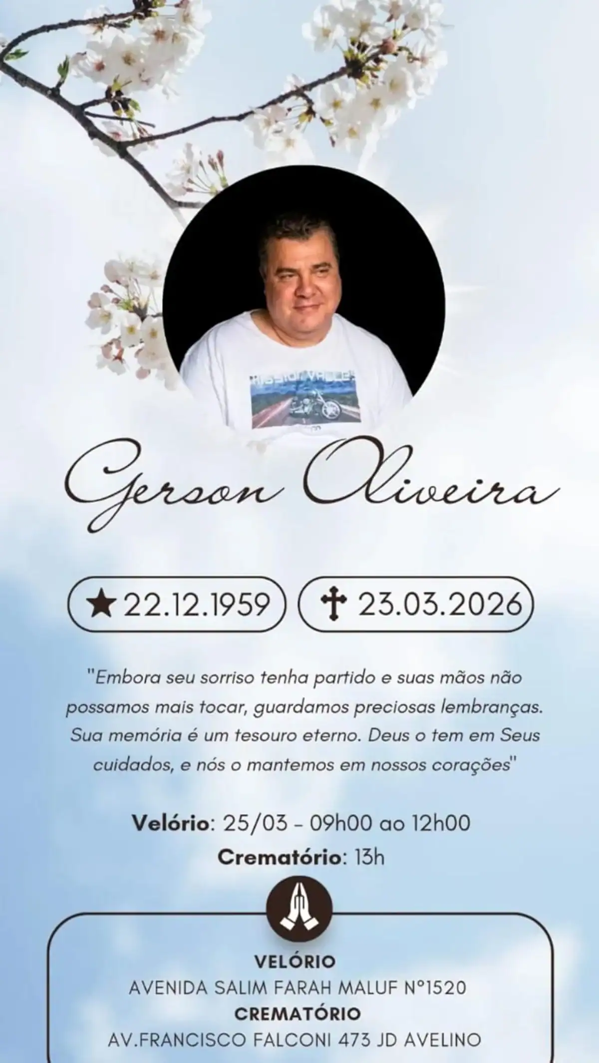 A família divulgou detalhes sobre o velório e a cerimônia de cremação do ator Gerson Brenner, que faleceu na noite desta segunda-feira (23/3), aos 66 anos. O ator, conhecido por novelas como Rainha da Sucata e Corpo Dourado, estava hospitalizado desde o dia 16 devido a um quadro de sepse.