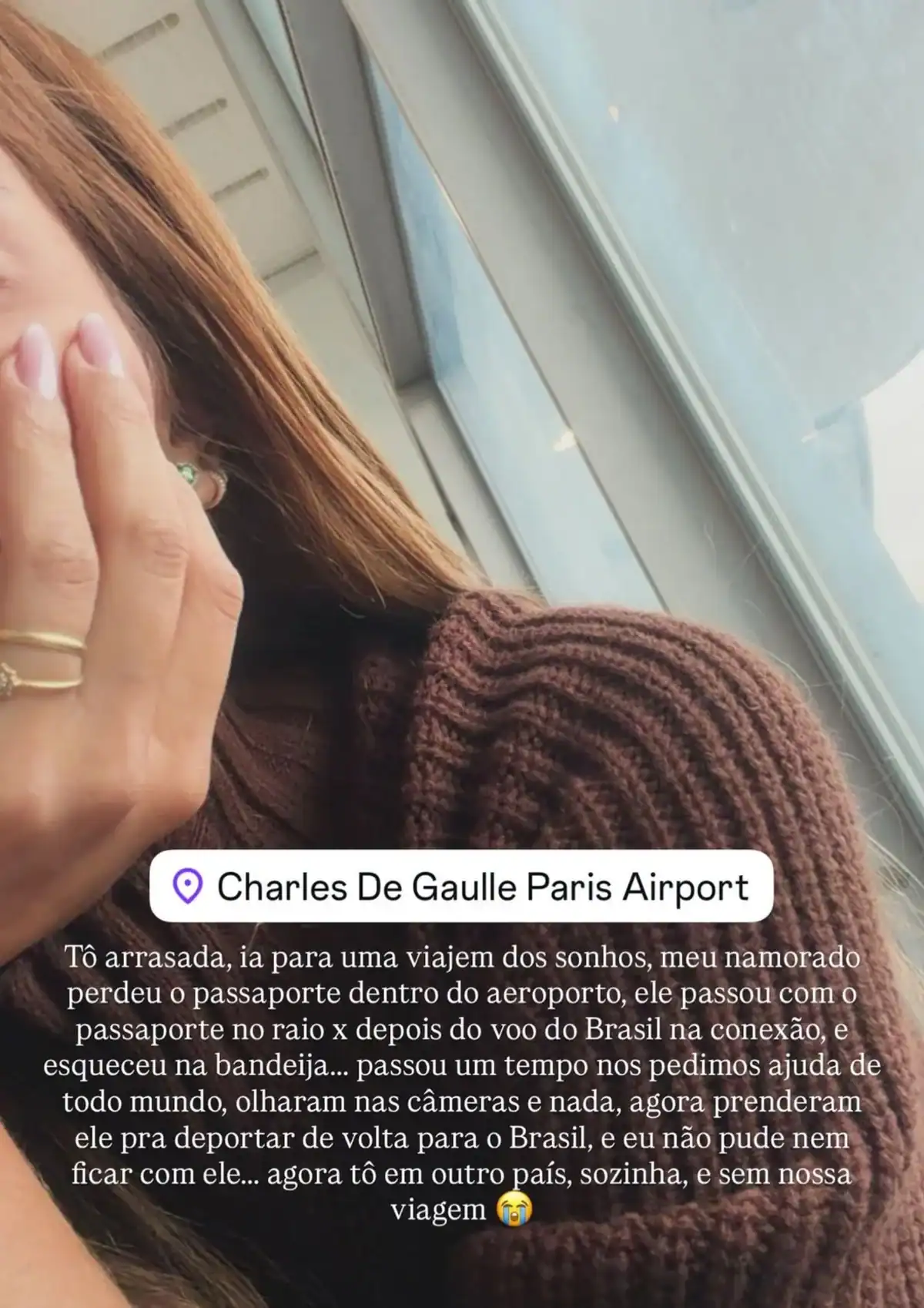 “Tô arrasada, ia para uma viagem dos sonhos, meu namorado perdeu o passaporte dentro do aeroporto, ele passou com o passaporte no raio-x depois do voo do Brasil na conexão, e esqueceu na bandeja… passou um tempo, nós pedimos ajuda de todo mundo, olharam nas câmeras e nada, agora prenderam ele pra deportar de volta para o Brasil, e eu não pude nem ficar com ele… agora tô em outro país, sozinha, e sem nossa viagem”, desabafou.