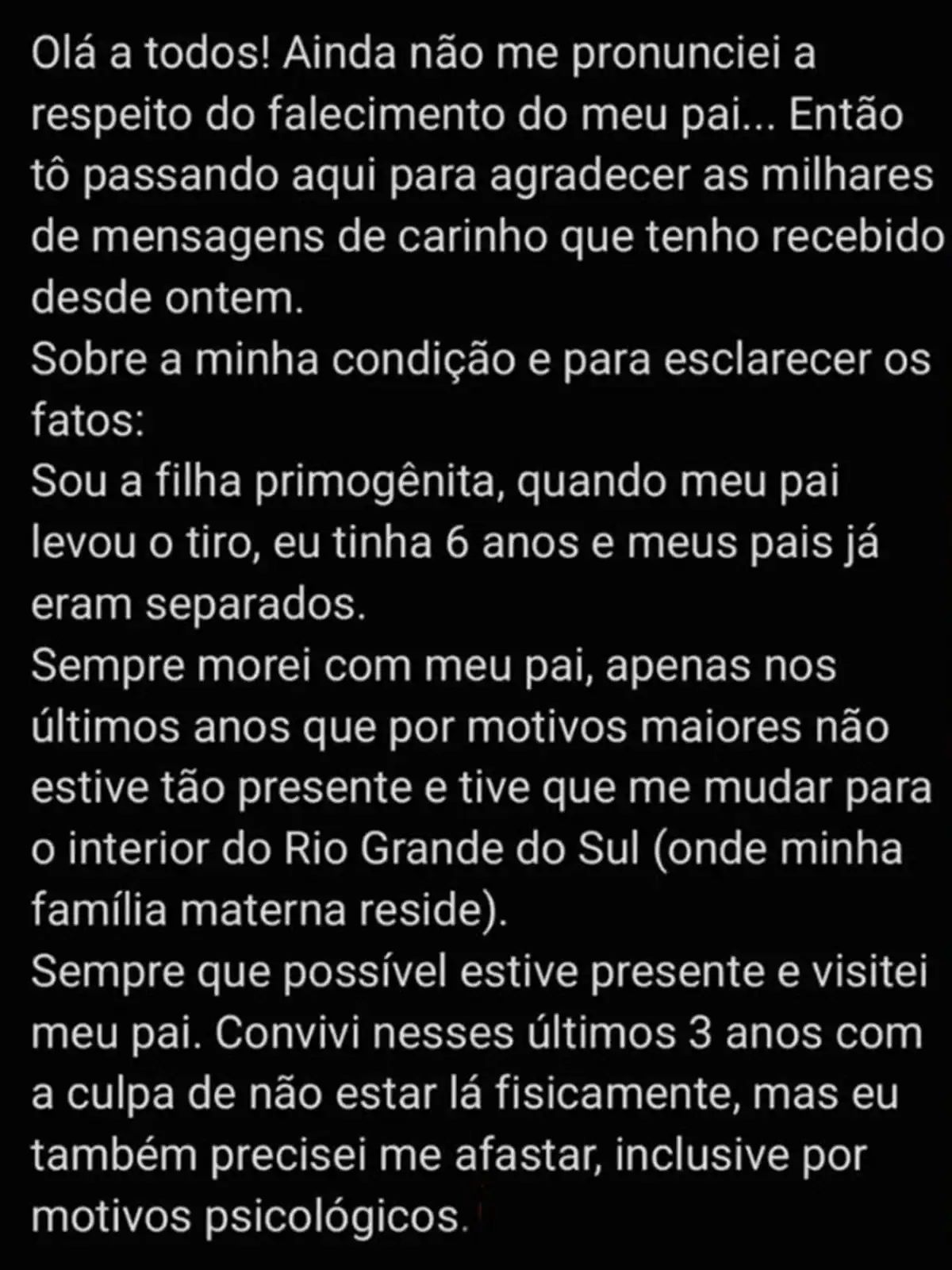 Ainda na publicação, ela revelou: “Sobre minha condição e para esclarecer os fatos: sou a filha primogênita. Quando meu pai foi baleado, eu tinha 6 anos e meus pais já estavam separados. Sempre morei com meu pai, apenas nos últimos anos que, por razões maiores, não estive tão presente e tive que me mudar para o interior do Rio Grande do Sul (onde minha família materna reside)”, contou, antes de completar: