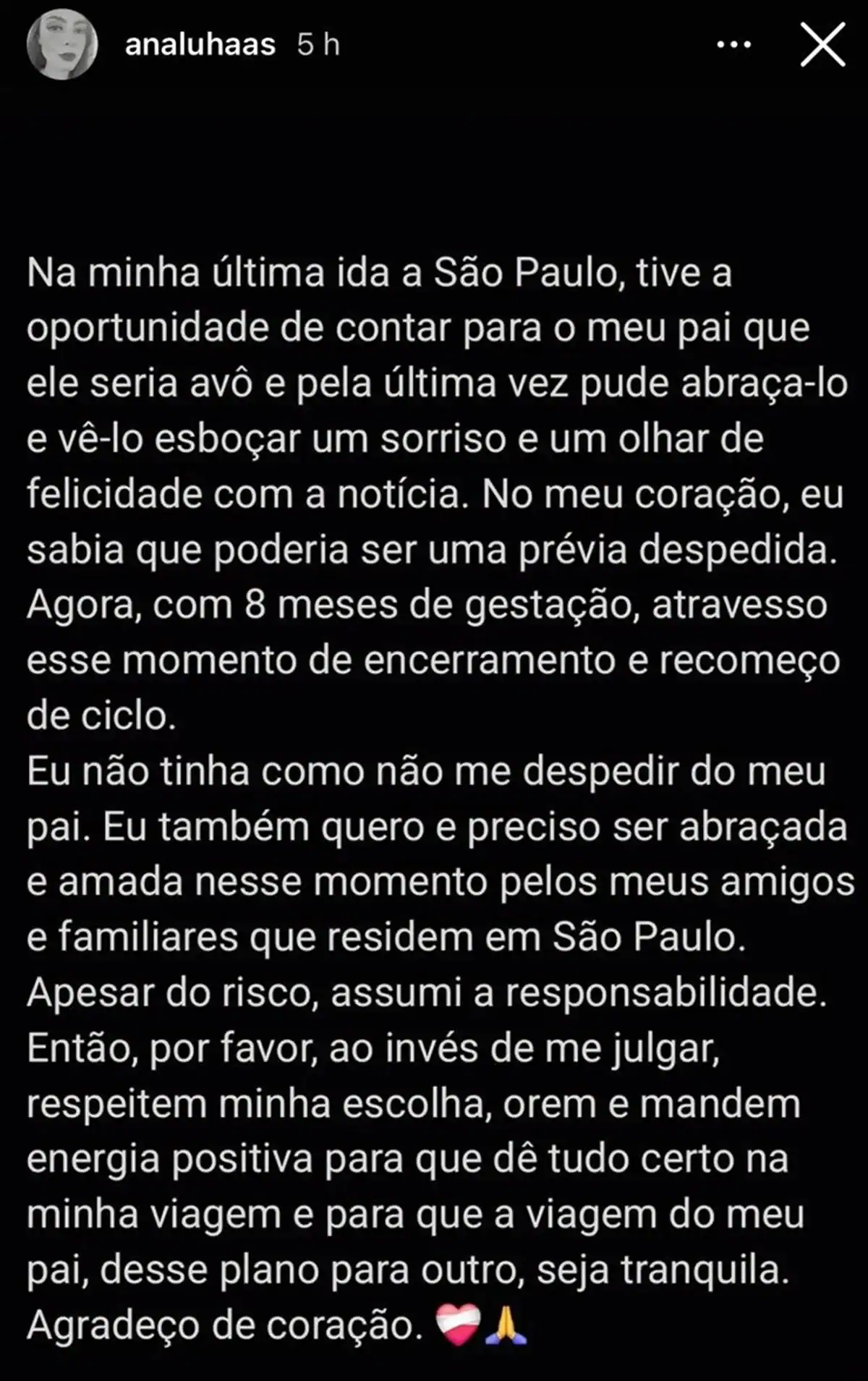 Em seguida, Ana Luísa Haas pediu: “Eu também quero e preciso ser abraçada e amada nesse momento pelos meus amigos e familiares que residem em São Paulo. Apesar do risco, assumi a responsabilidade”, observou.