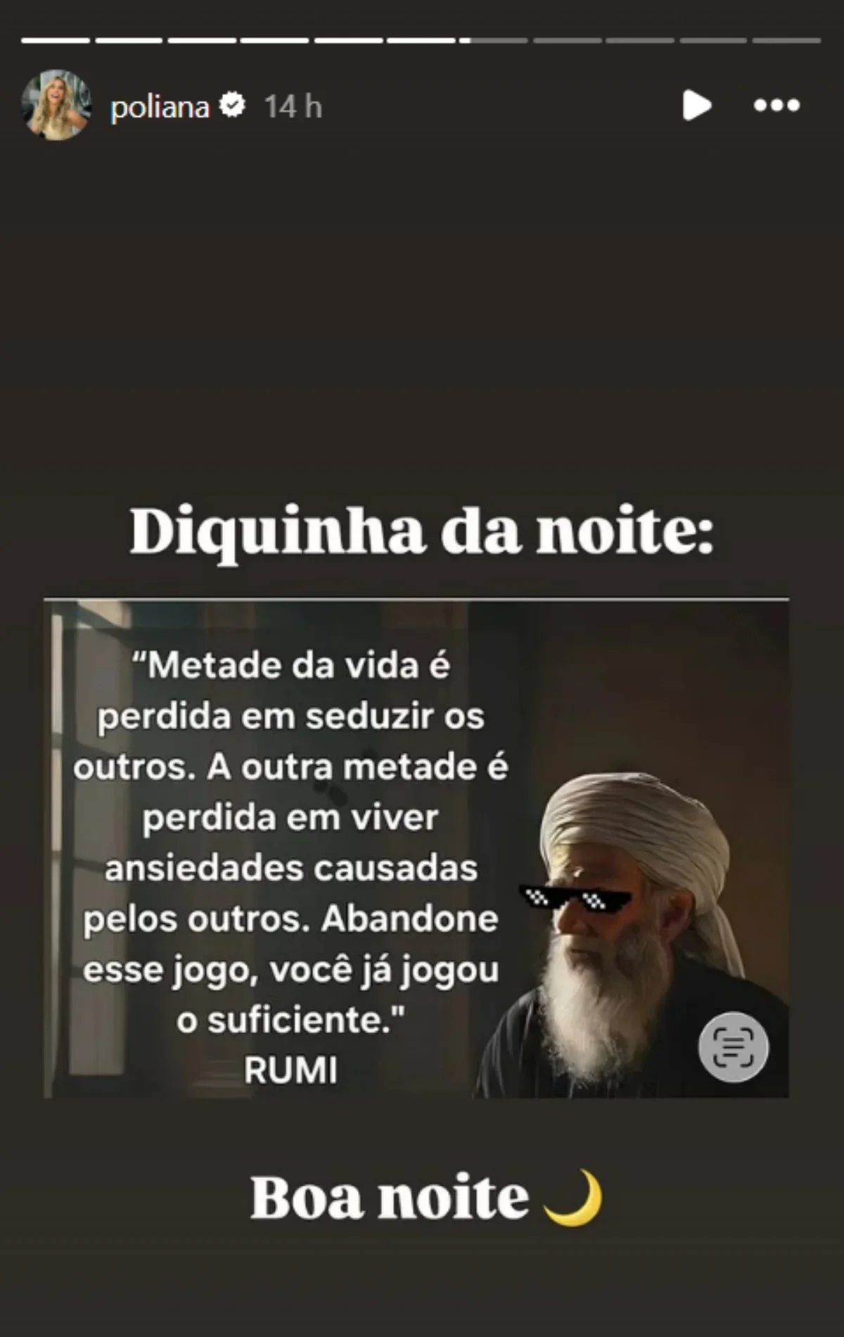 “Metade da vida é perdida em seduzir os outros. A outra metade é perdida em viver ansiedades causadas pelos outros. Abandone esse jogo, você já jogou o suficiente”, dizia a reflexão.