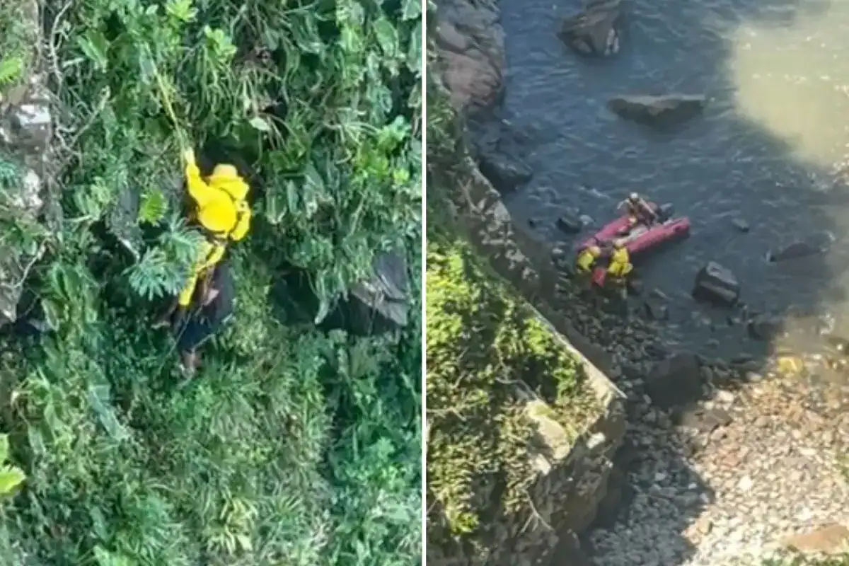 Um vídeo divulgado pelos bombeiros mostra a operação de resgate. De acordo com a corporação, foi necessário um esforço conjunto que envolveu cinco socorristas.