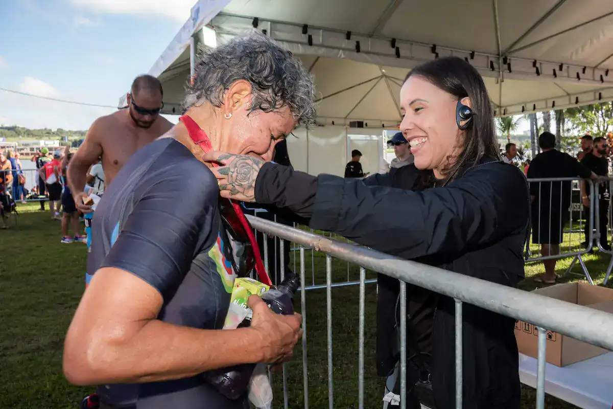 Voluntária entrega medalha a atleta ao final do aquathlon de abertura do Metrópoles Endurance no Pontão do Lago Sul (Foto: Instagram)