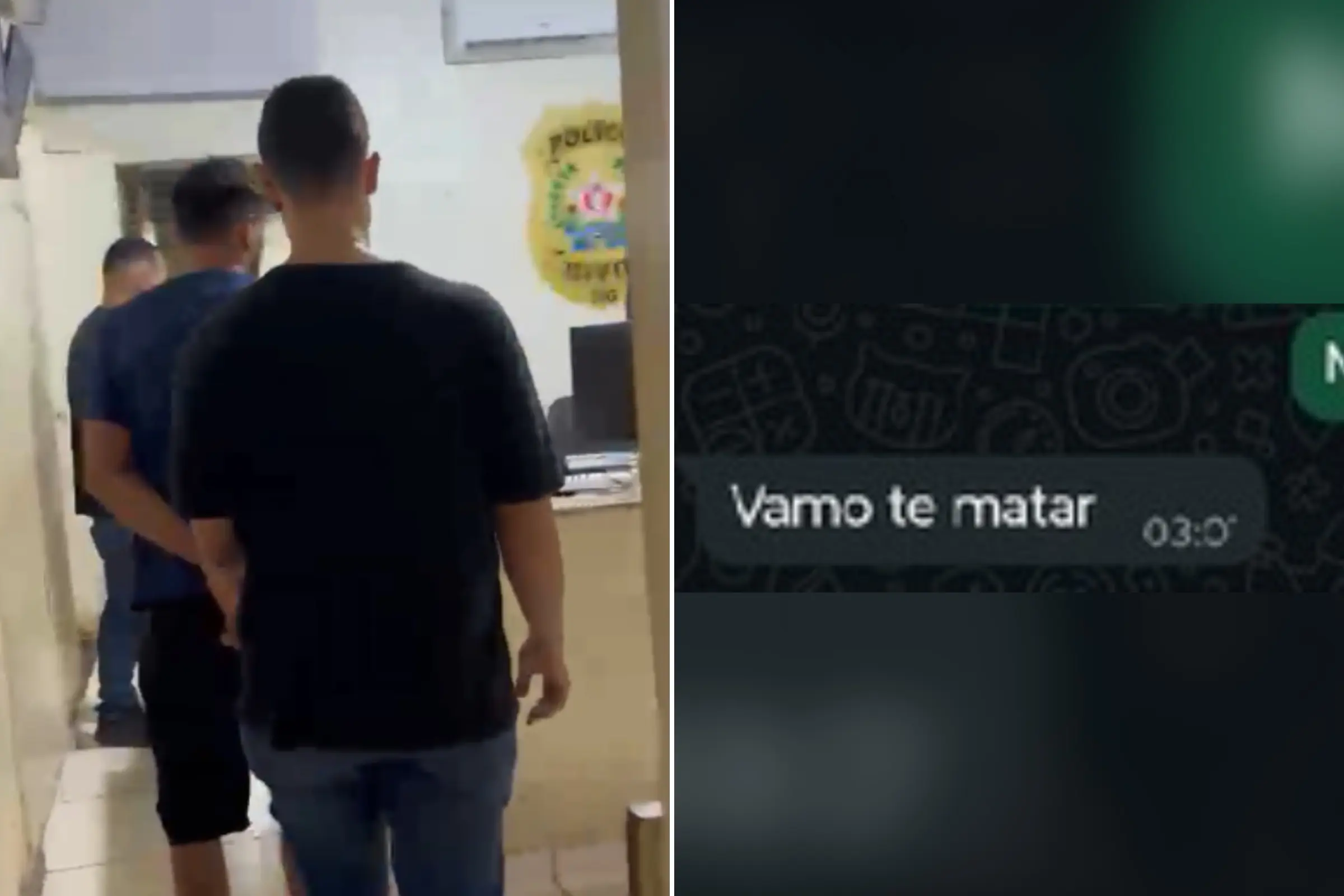 Suspeitos da Operação Atração Perigosa são conduzidos pela Polícia Civil; à direita, print de mensagem de WhatsApp com ameaça (Foto: Instagram)