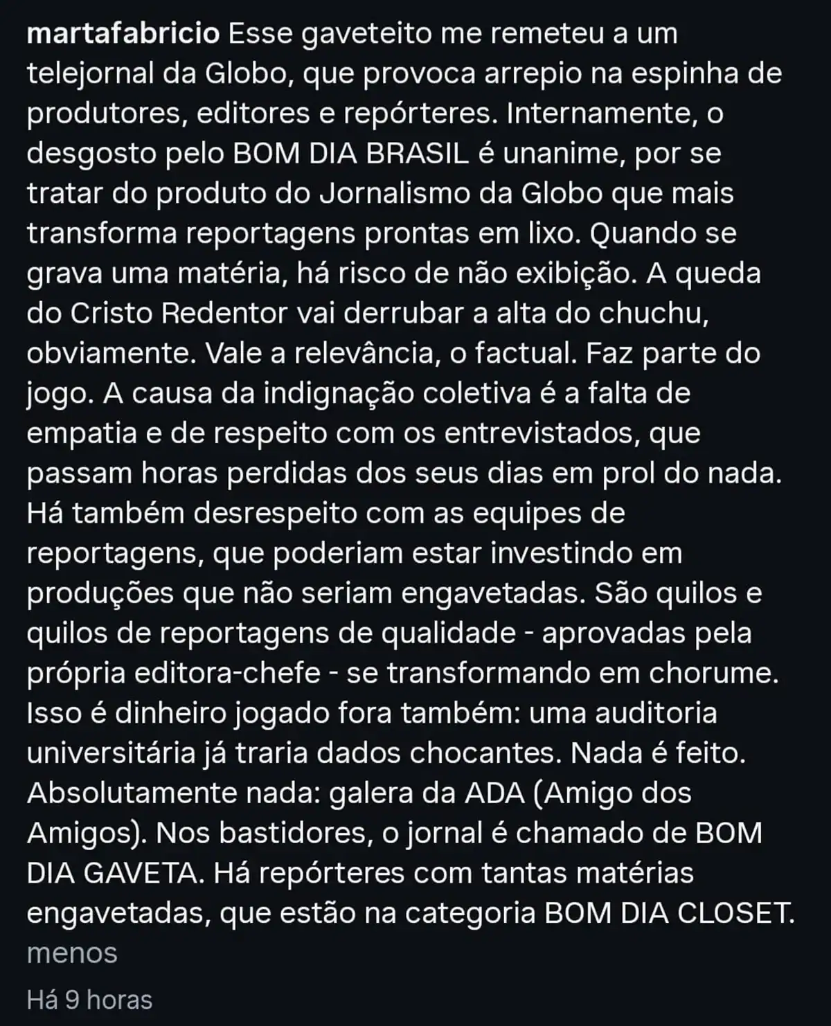 “Esse gaveteiro me lembra um telejornal da Globo que causa arrepio na espinha de produtores, editores e repórteres. Internamente, o descontentamento com o Bom Dia Brasil é geral, pois é o produto do jornalismo da Globo que mais transforma reportagens prontas em lixo”, afirmou, antes de completar: