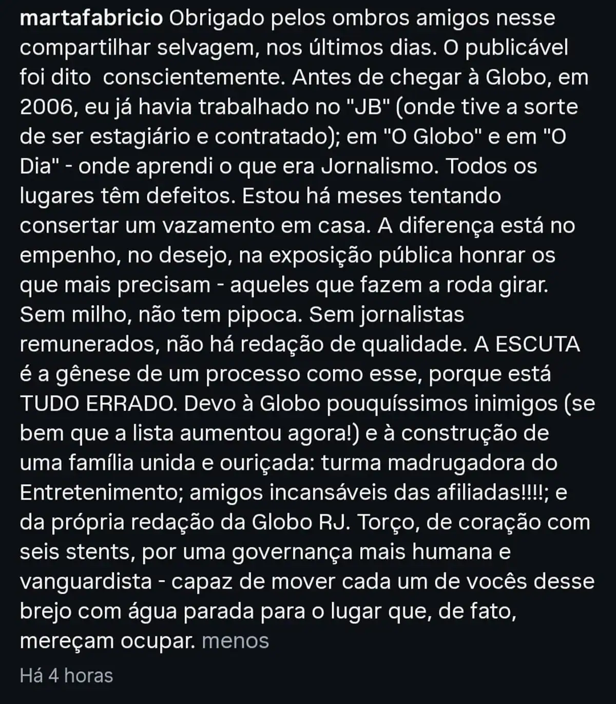 Ainda na publicação, o comunicador analisou: “A escuta é a gênese de um processo como esse, porque está tudo errado. Devo à Globo pouquíssimos inimigos (se bem que a lista aumentou agora!) e à construção de uma família unida e ouriçada: turma madrugadora do Entretenimento; amigos incansáveis das afiliadas!!!! E da própria redação da Globo RJ”, escreveu, antes de completar: