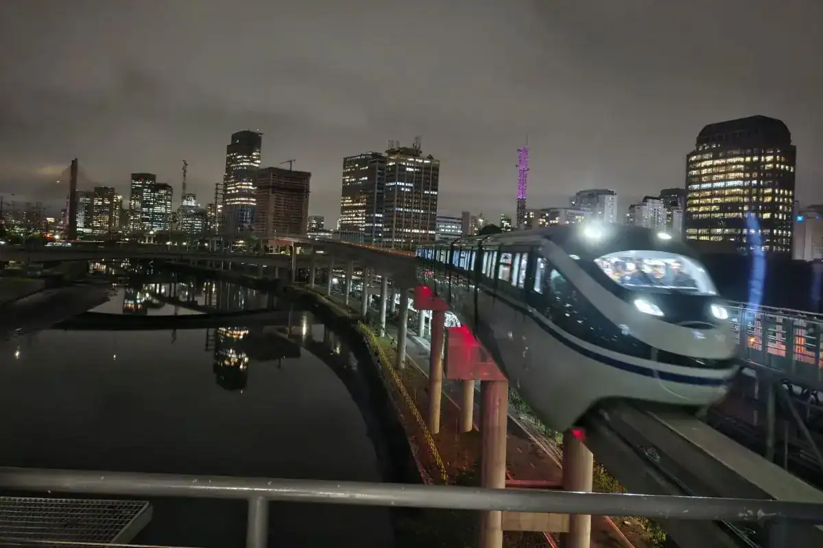 Monotrilho da Linha 17-Ouro cruza o Rio Pinheiros com a Ponte Estaiada ao fundo na noite de estreia (Foto: Instagram)