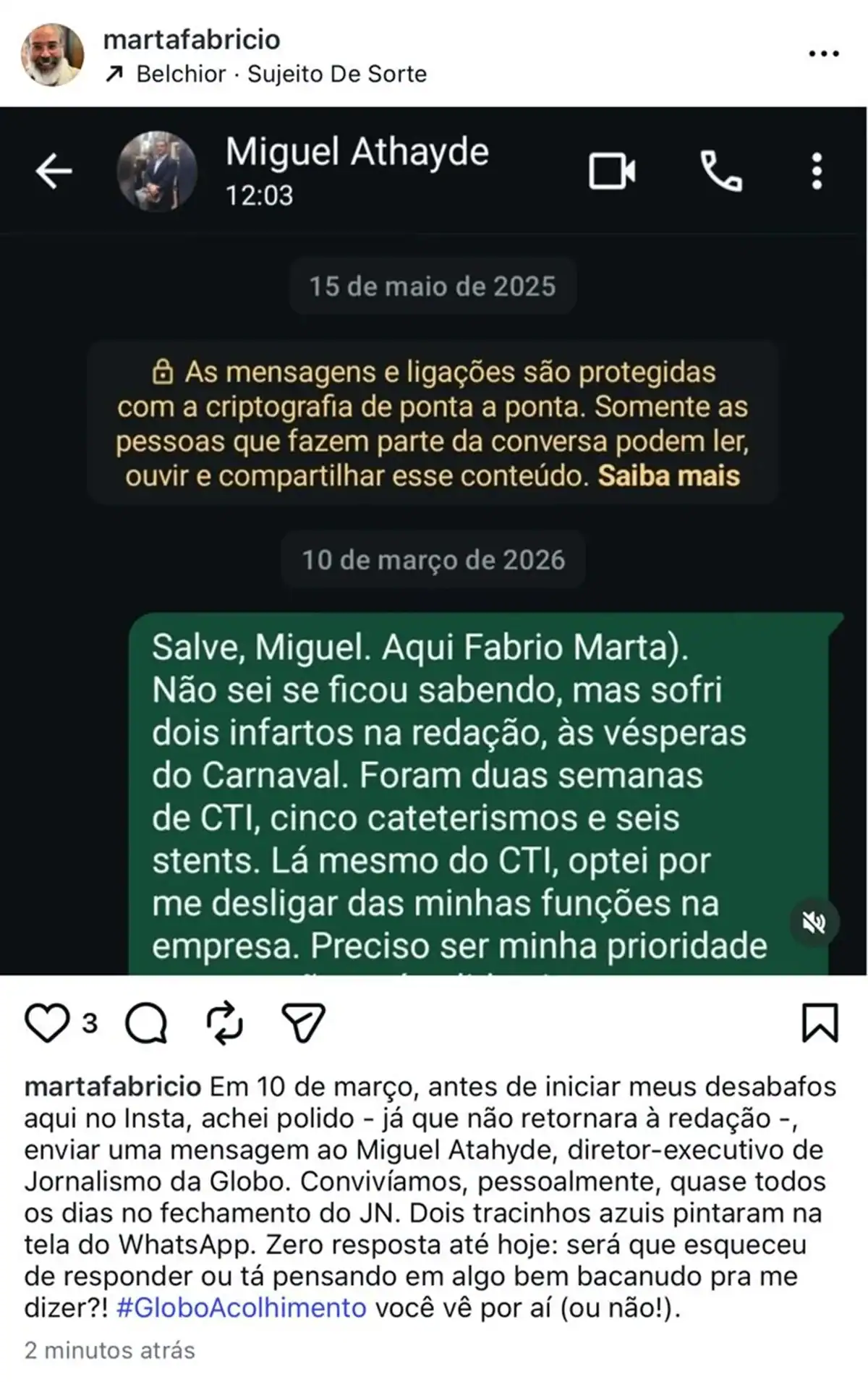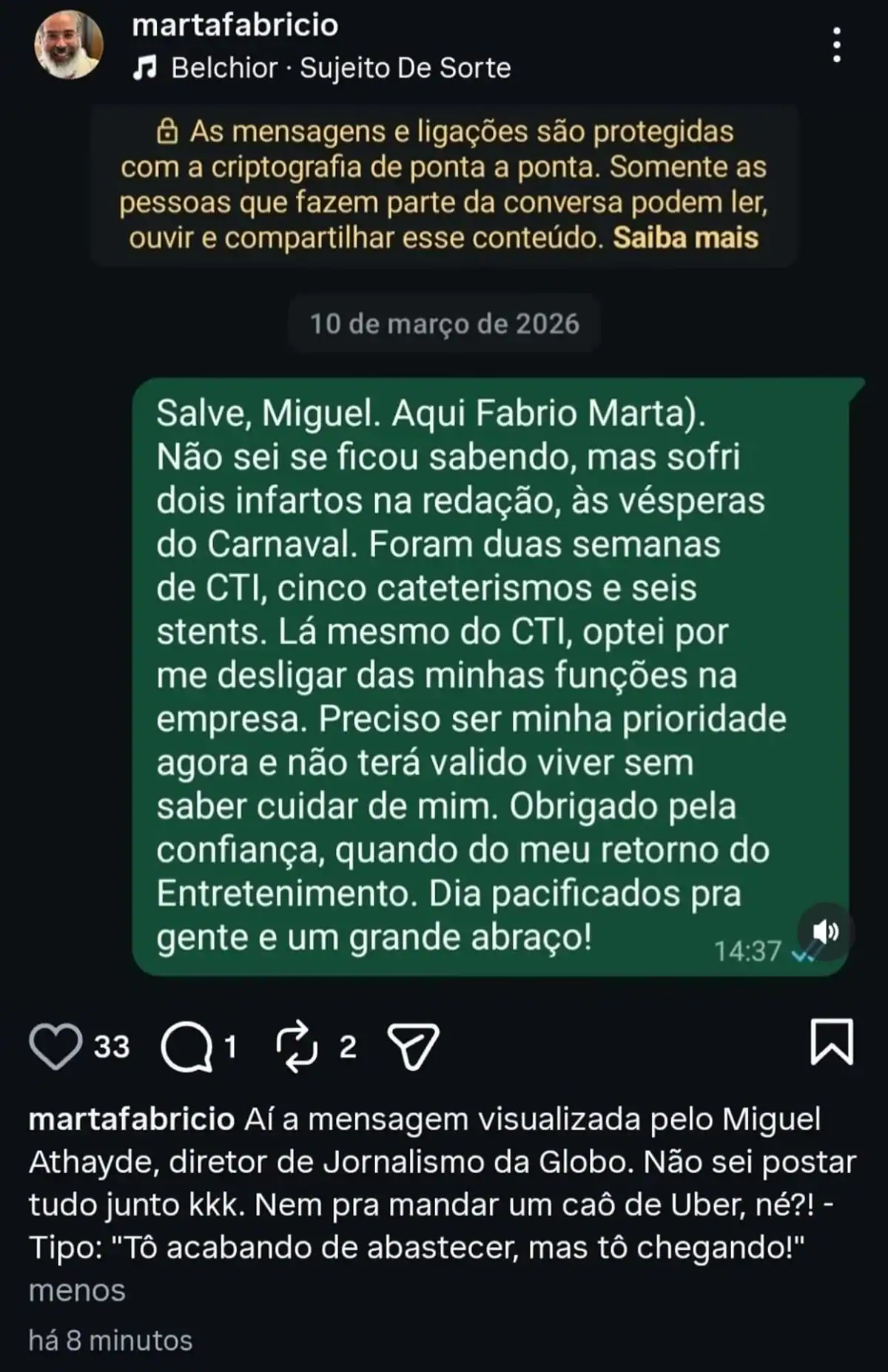 No texto, o ex-produtor comentou: “Salve, Miguel. Aqui Fabricio Marta. Não sei se soube, mas tive dois infartos na redação, às vésperas do Carnaval. Foram duas semanas de CTI, cinco cateterismos e seis stents. Lá mesmo do CTI, optei por me desligar das minhas funções na empresa. Preciso ser minha prioridade agora e não terá valido viver sem saber cuidar de mim“, afirmou, antes de completar:
